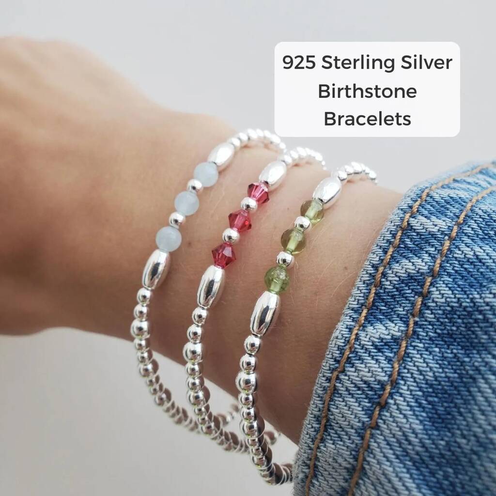 Sterling Silver Birthstone Bracelet: Elastic Beaded Birth Month Gemstone Jewellery