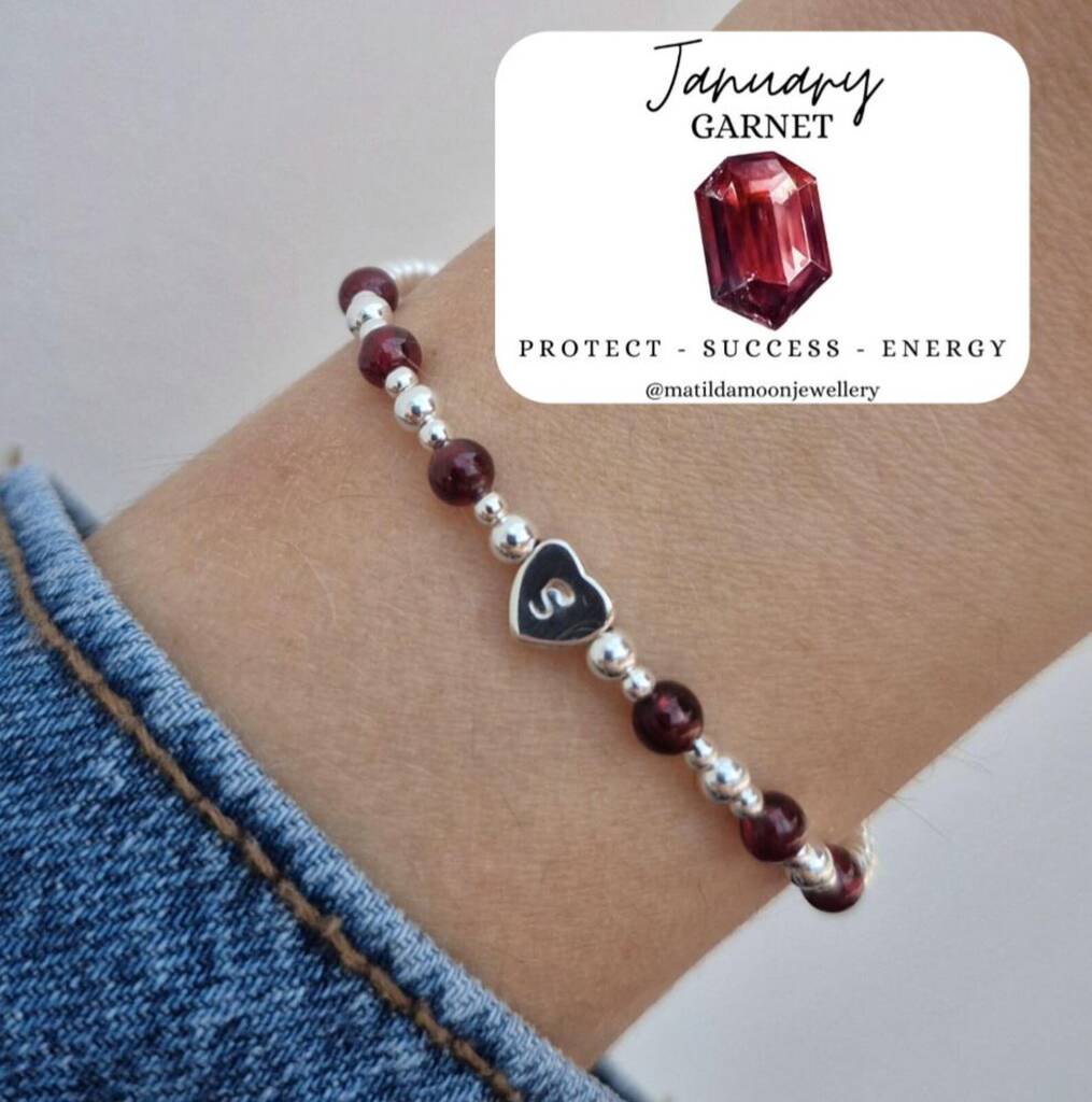 Sterling Silver January Garnet Beaded Bracelet: January Birthstone Personalised Initial Heart