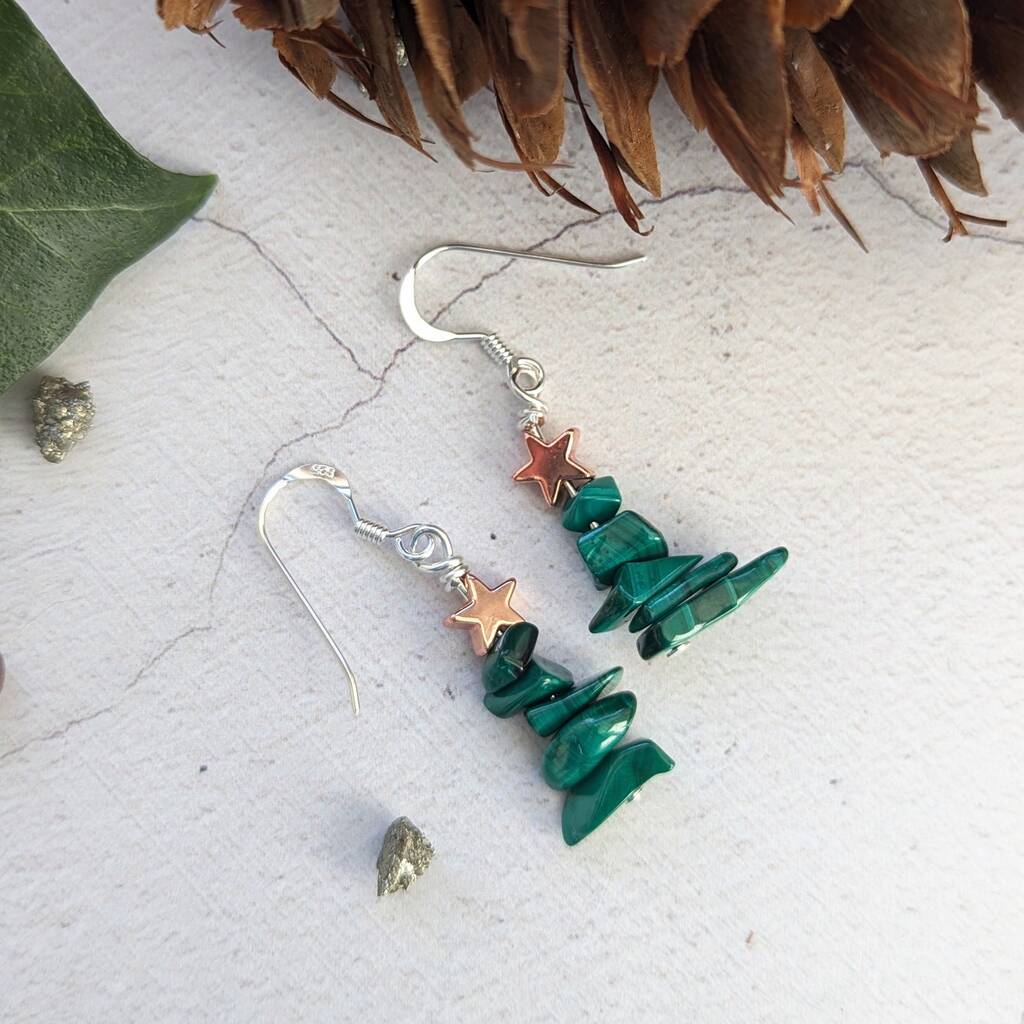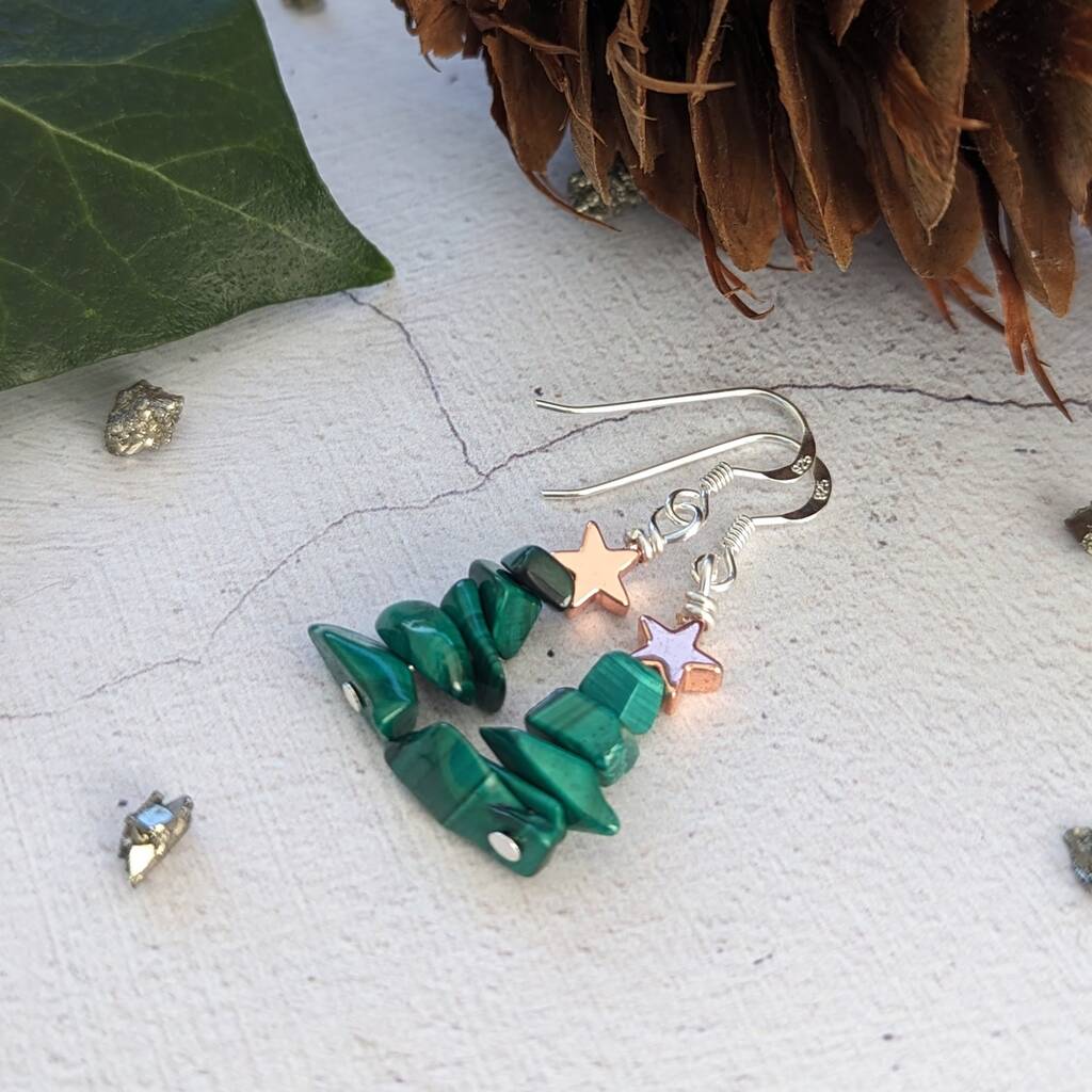 These Christmas gemstone earrings have been handmade from beautiful, malachite stones,. These are nugget and chip beads that have been carefully chosen to create a Christmas tree design. We've finished the design with a beautiful rose gold plated hematite star.Our Christmas earrings have been crafted from genuine gemstones, wired onto sterling silver pins and finished with high quality wires. The finishing touch on these beautiful Christmas themed earrings is the hematite star - plated in rose gold - which we know is always a favourite.