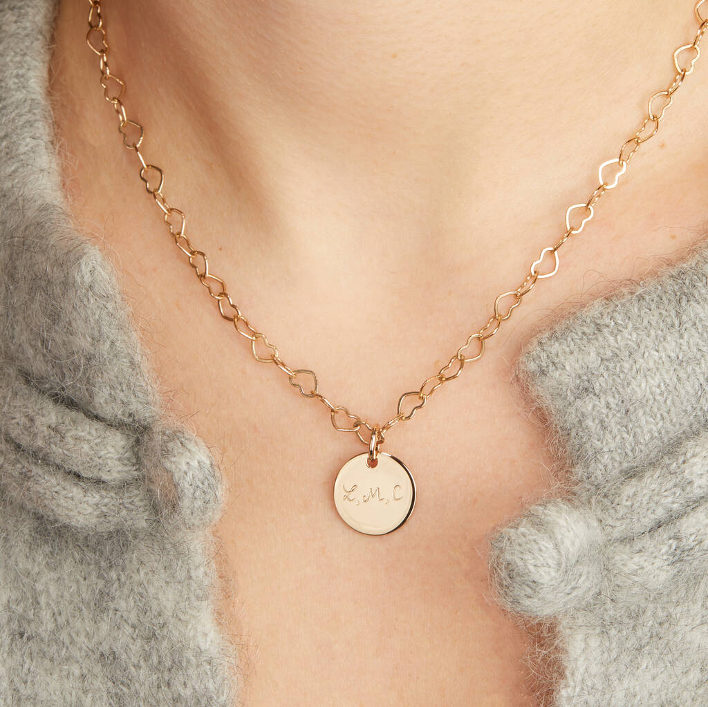 The charms on our Personalised Heart Chain Necklace represent a precious bond that you can use to represent your relationship with a hand-engraved disc.