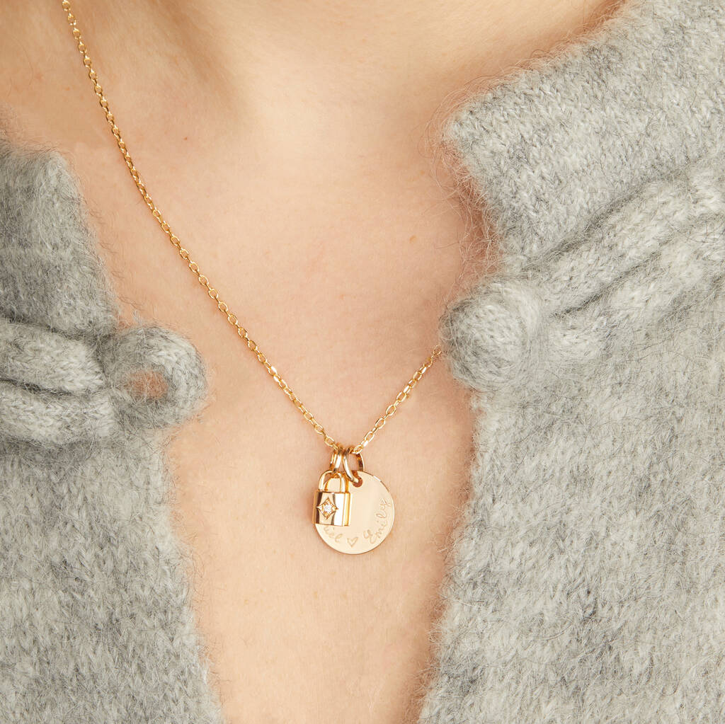 Each necklace disc can be engraved with a name, date or meaningful word, making each piece a unique gesture to gift to a loved one or friend. The Padlock and Key charms move freely along the chain.