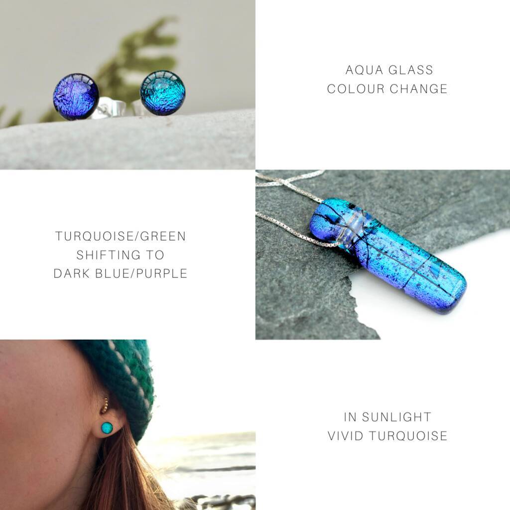 All Mere Glass jewellery is made from a base of coloured, dichroic glass. Dichroic glass is coated with an incredibly thin layer of metal which creates luminous and intense colours in the jewellery which change as the wearer moves. The glass is has a wonderful clarity of colour in daylight then, as the light dims, it seems to glow.