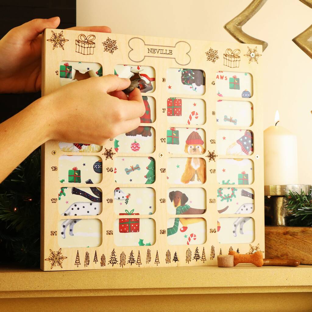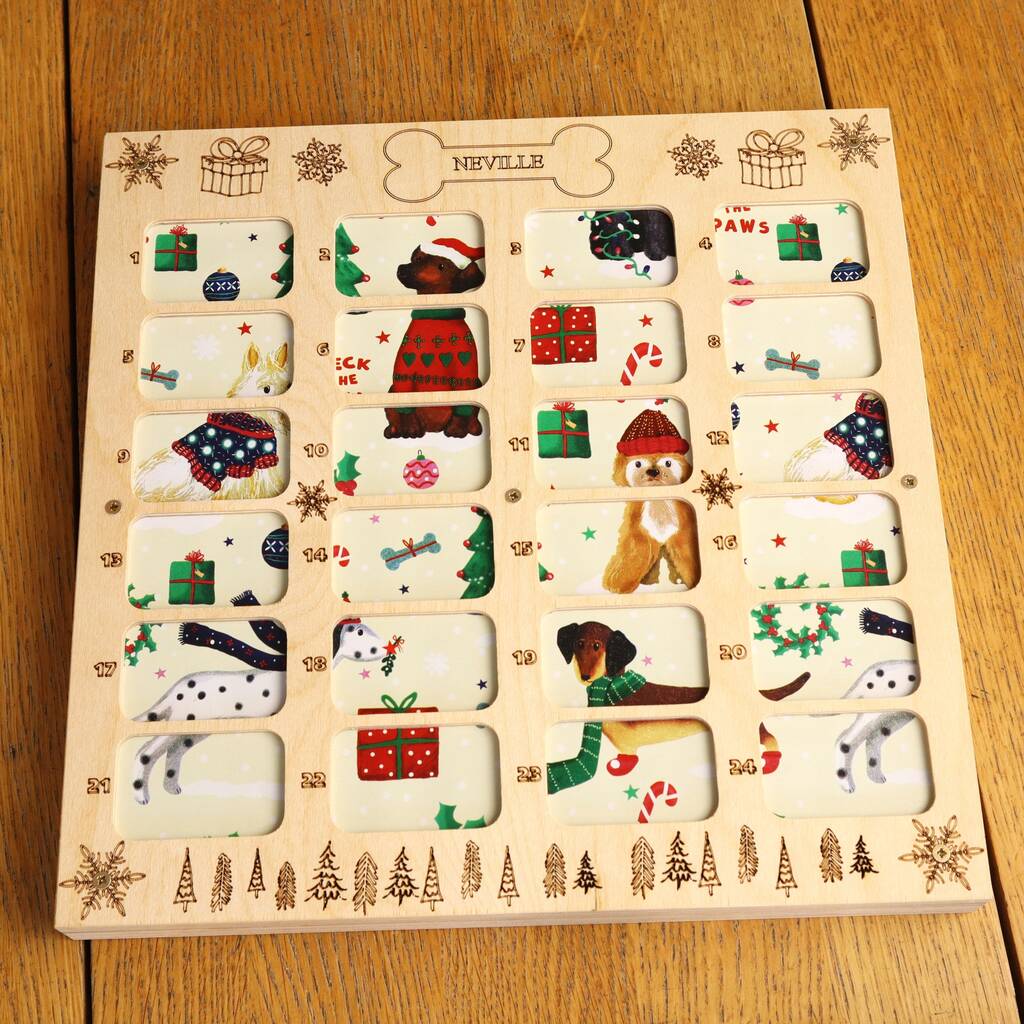 A UK-made personalised wooden advent calendar for dogs, reusable year after year and perfect for filling with festive treats throughout the Christmas countdown.