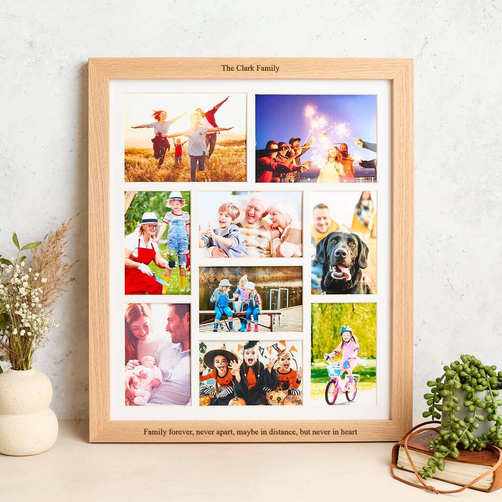 A contemporary solid oak personalised multi aperture photo frame engraved in a portrait or landscape orientation with photo upload and print option for nine photographs.