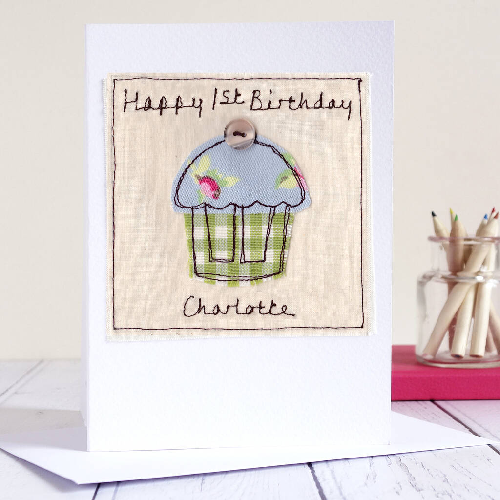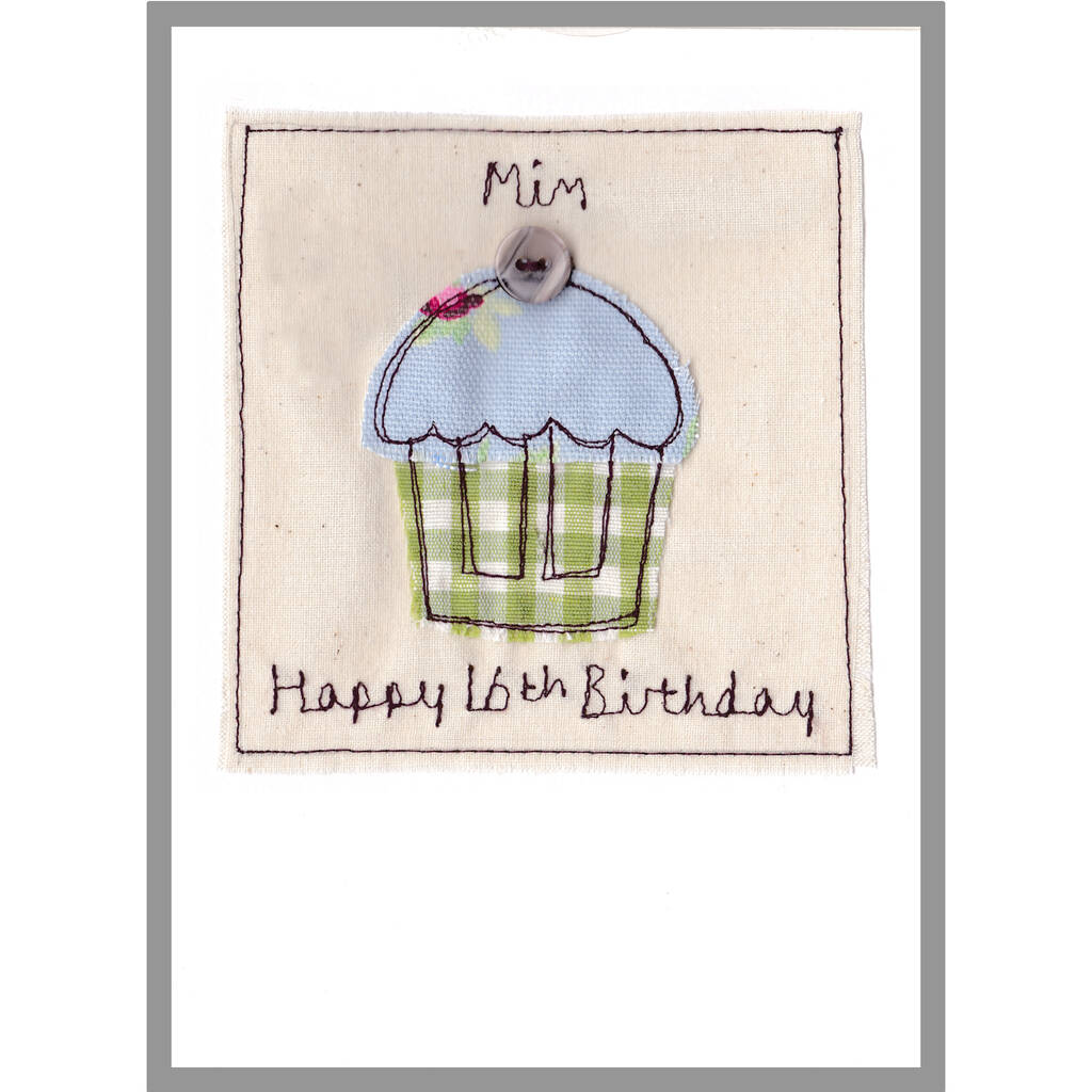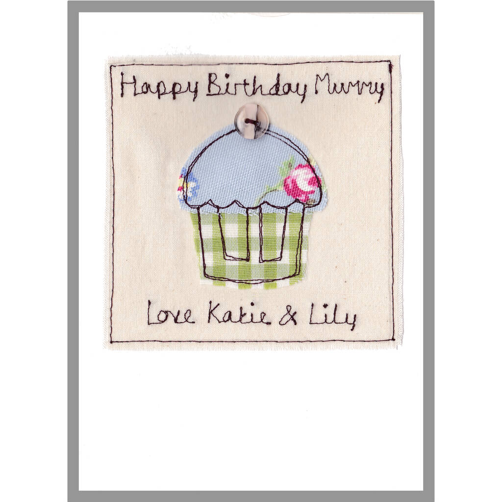 The embroidered fabric card is available in 2 designs. Choose from CUPCAKE with a button on top, or BIRTHDAY CAKE.