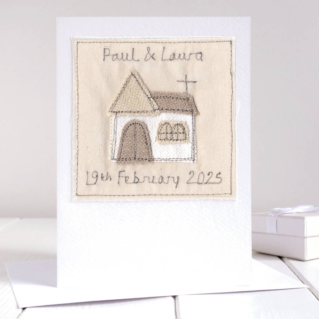 The handmade card can be personalised with your own choice of words, which are embroidered above and below the appliqued church.