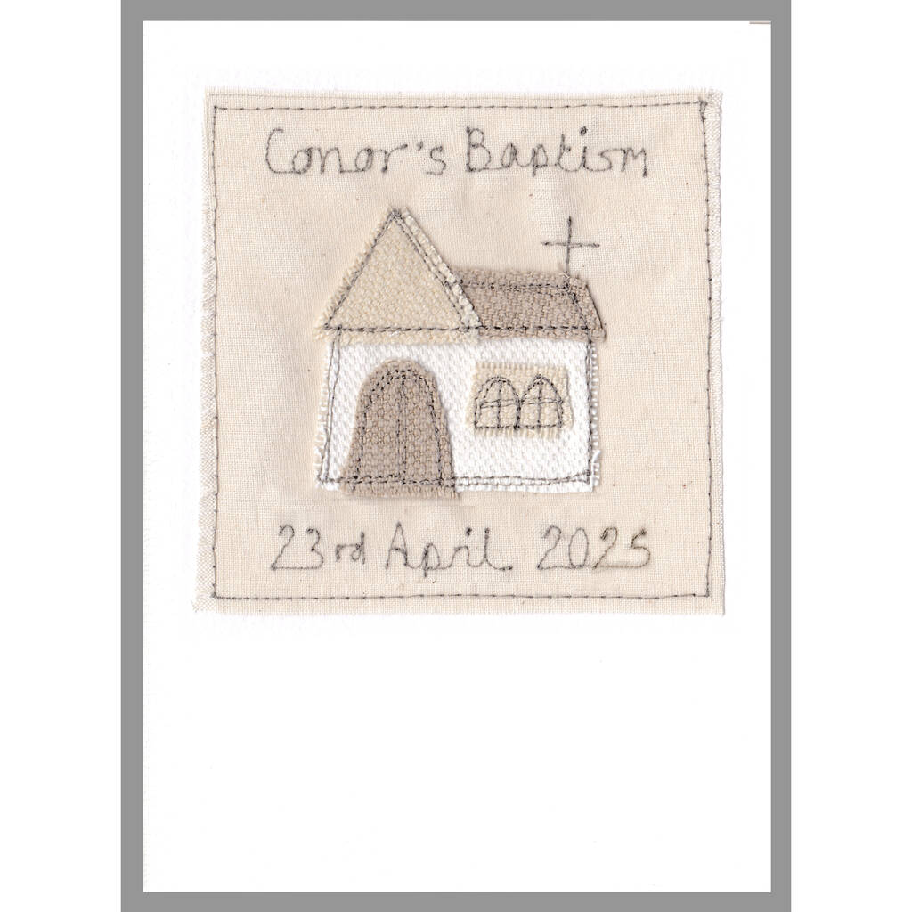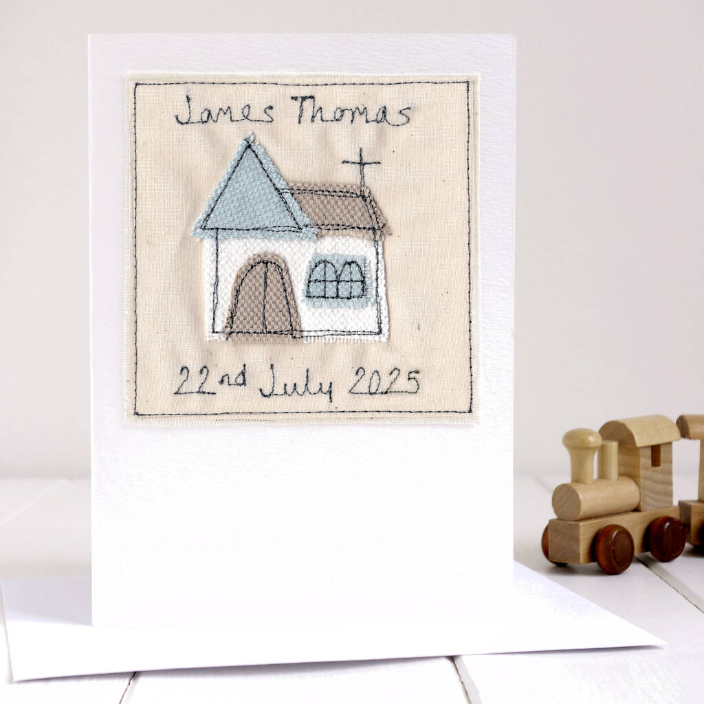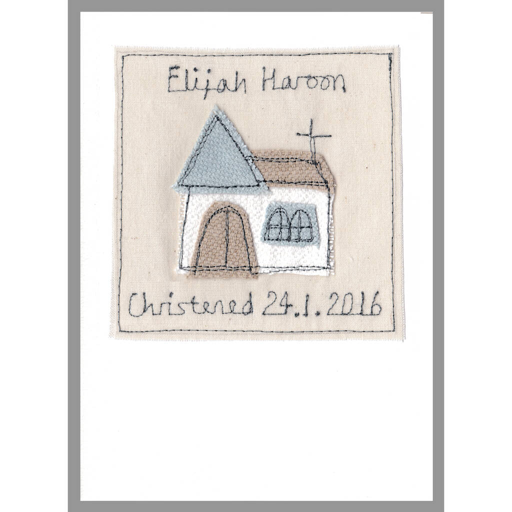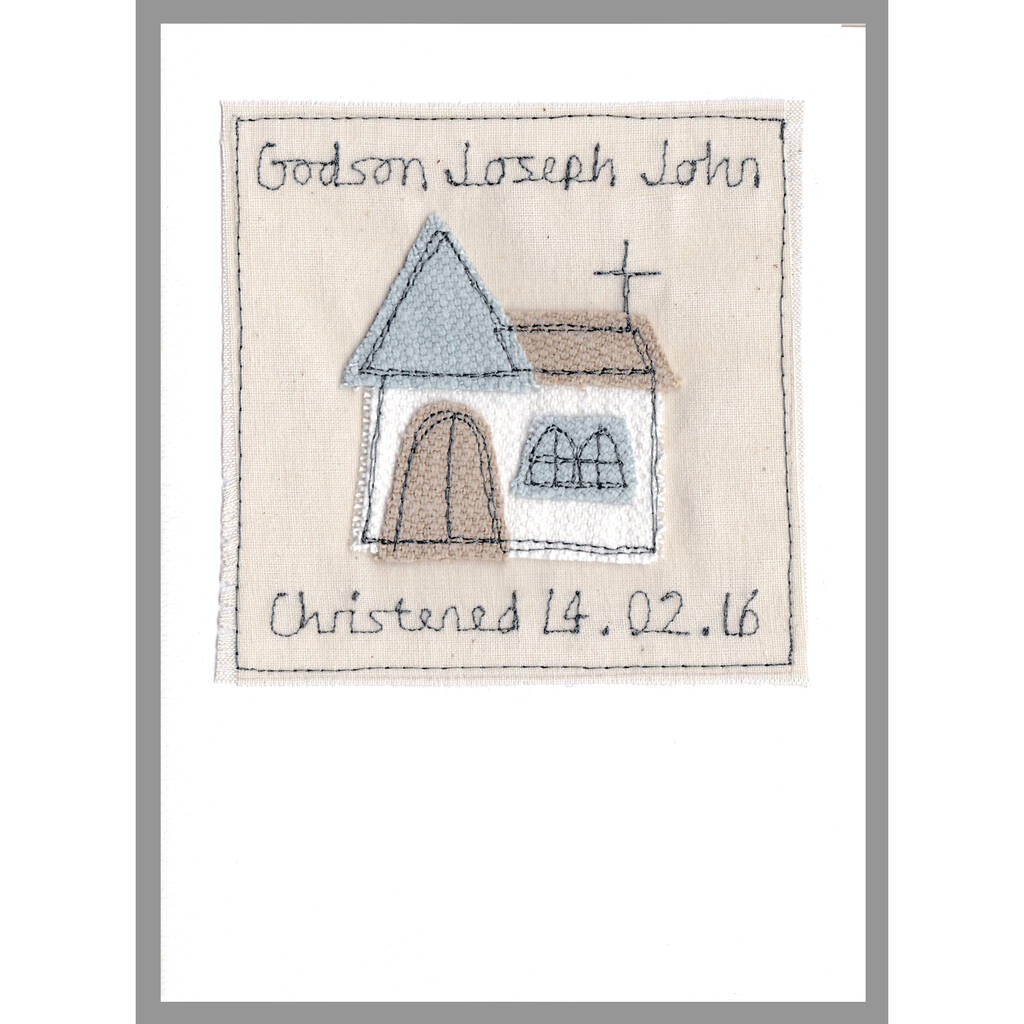 Beautifully handmade by milly and pip, this embroidered fabric card features an appliqued church to reflect the christening theme, plus space for your own personal message, which is embroidered above and below the church.