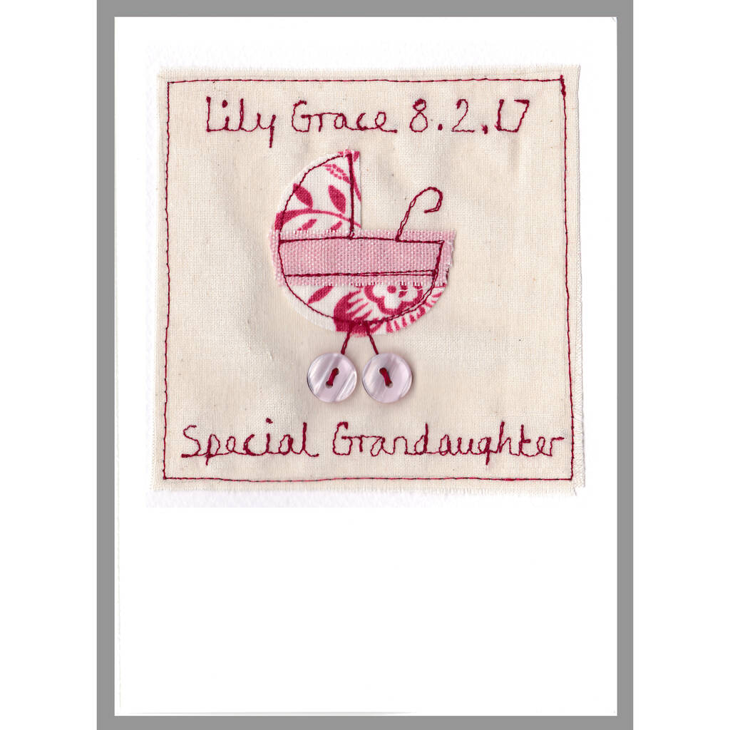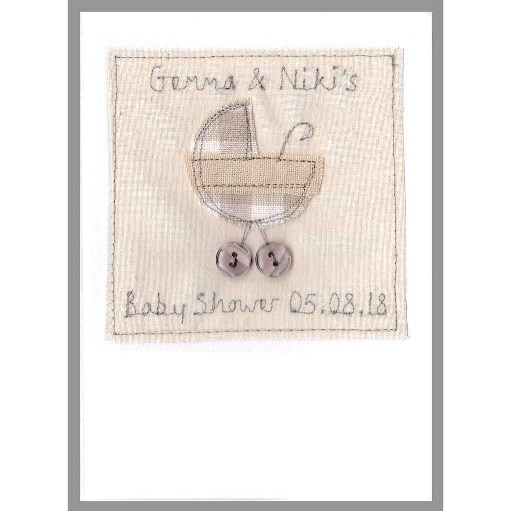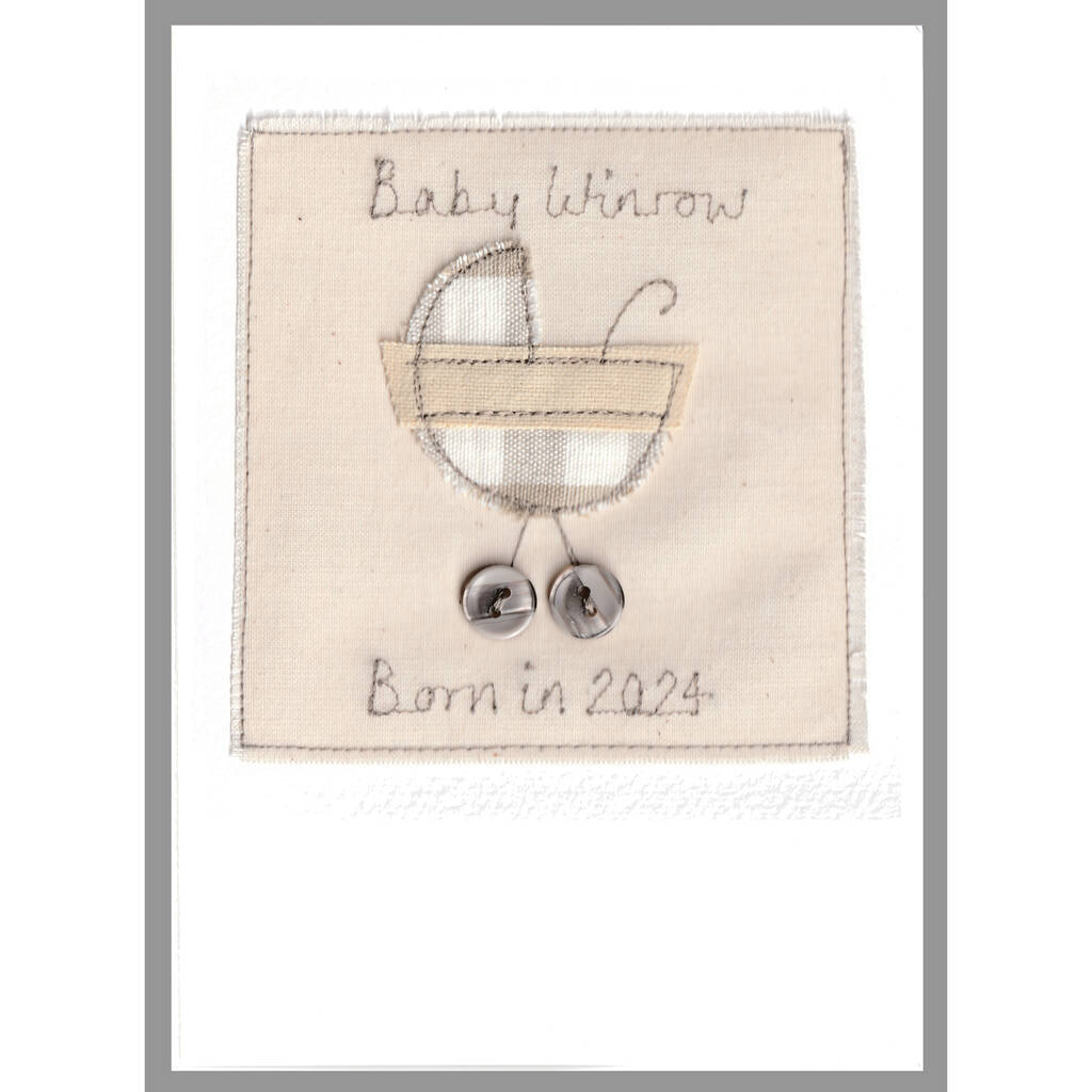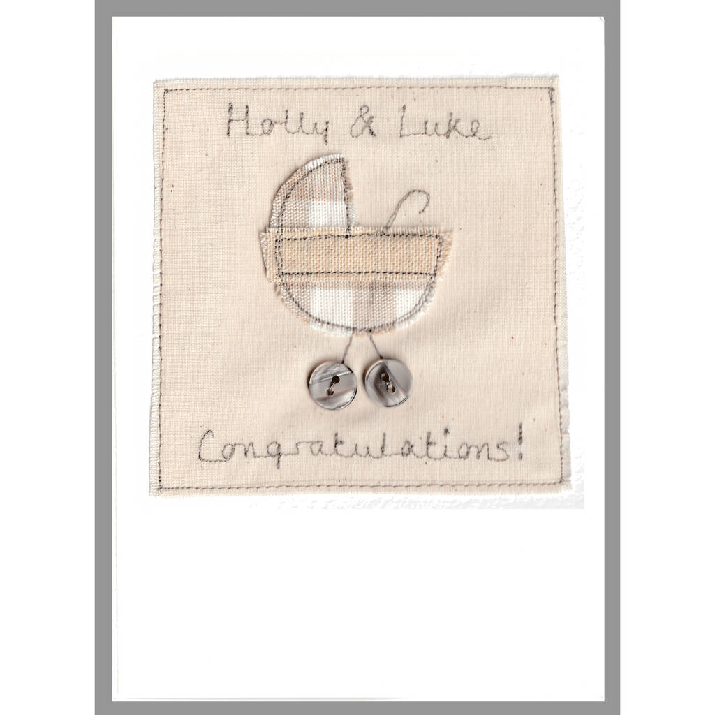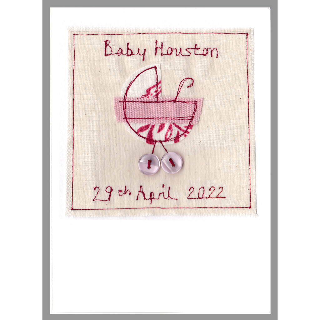 The handmade card can be personalised using names, dates or any words of your choice, which are embroidered above and below the appliqued pram.