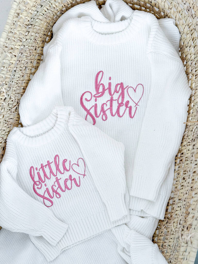 Style siblings up in these matching embroidered jumpers. Select from 'Big/Little' and 'Brother/Sister' before adding product to cart. Please note £28 is the price for 1 jumper, if you wish to buy a set of 2 please add 2 seperatejumpers to the basket.Second one can be added to basket when checking out the first. Models wear ivory jumpers with candy pink thread. Supporting male models wear ivory jumpers with copper thread.