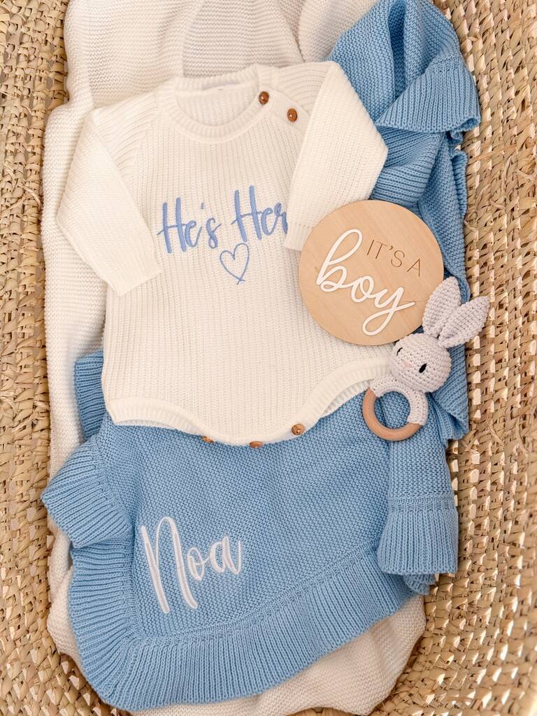These beautiful knitted blankets are the perfect accessory to the baby edit rompers. They make a great backdrop to any announcement photos as well as being a cosy baby blanket for crib, car or pram.