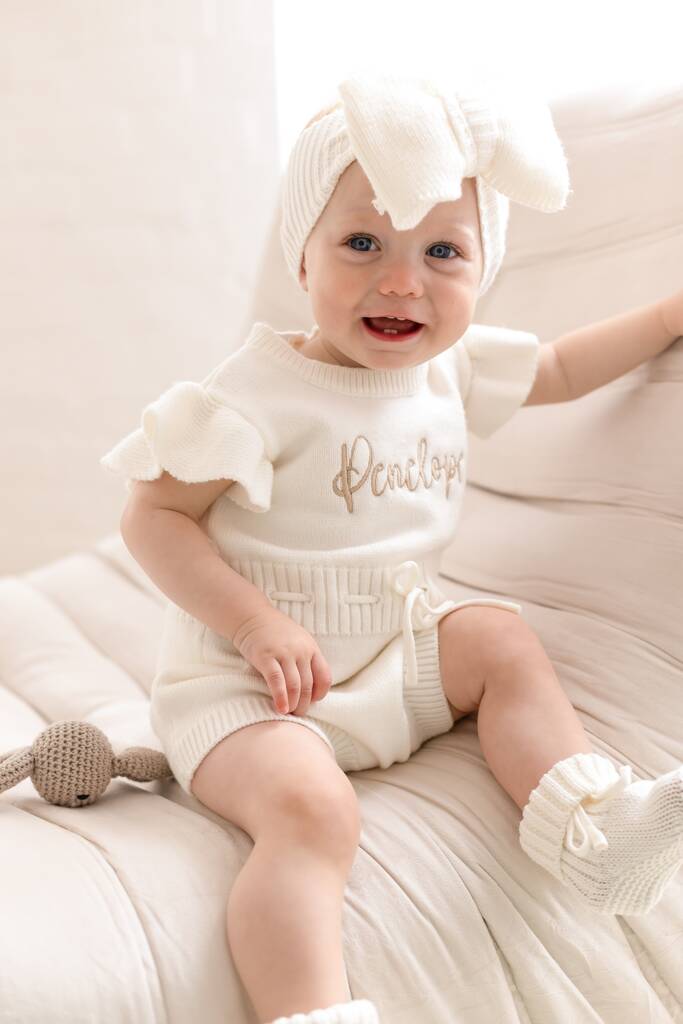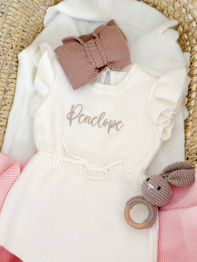 Gorgeous embroidered baby romper with frill sleeves and tie waist detailing, in super soft knit fabric. Personalised especially for you.