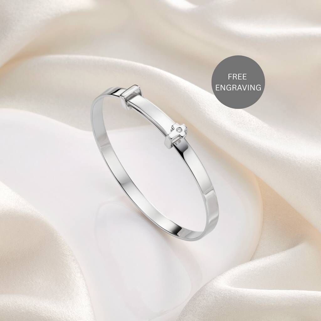 Crafted from hallmarked sterling silver, this expandable bangle features a delicate cross set with a genuine 1pt diamond, symbolising christenings, naming ceremonies, or first birthdays.