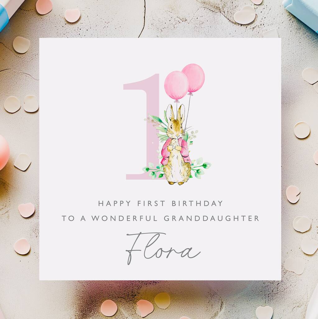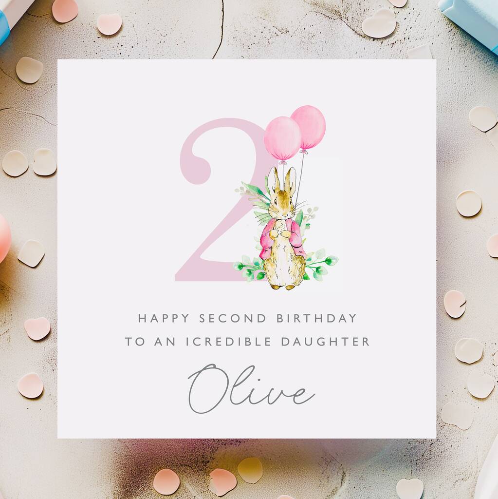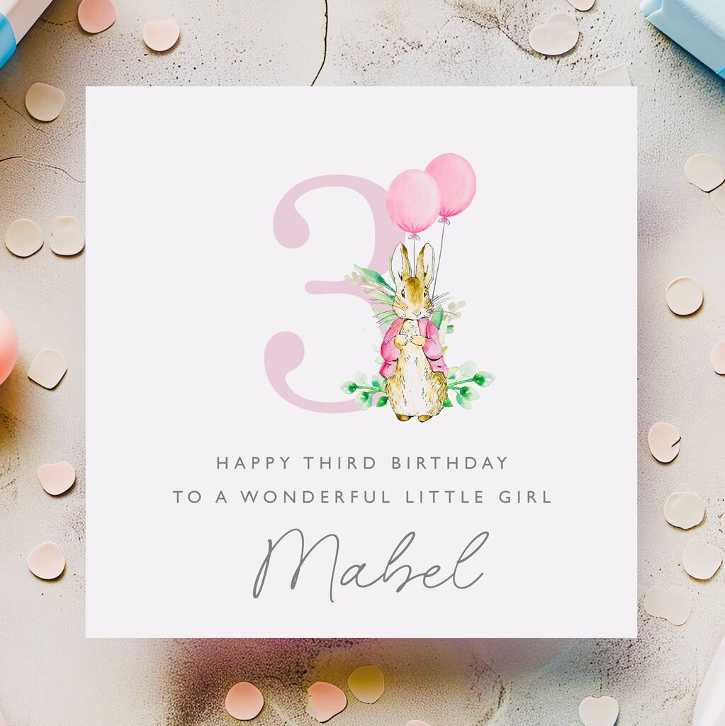 Personalised Flopsy Bunny + Pink Balloons Birthday Card *Age Options