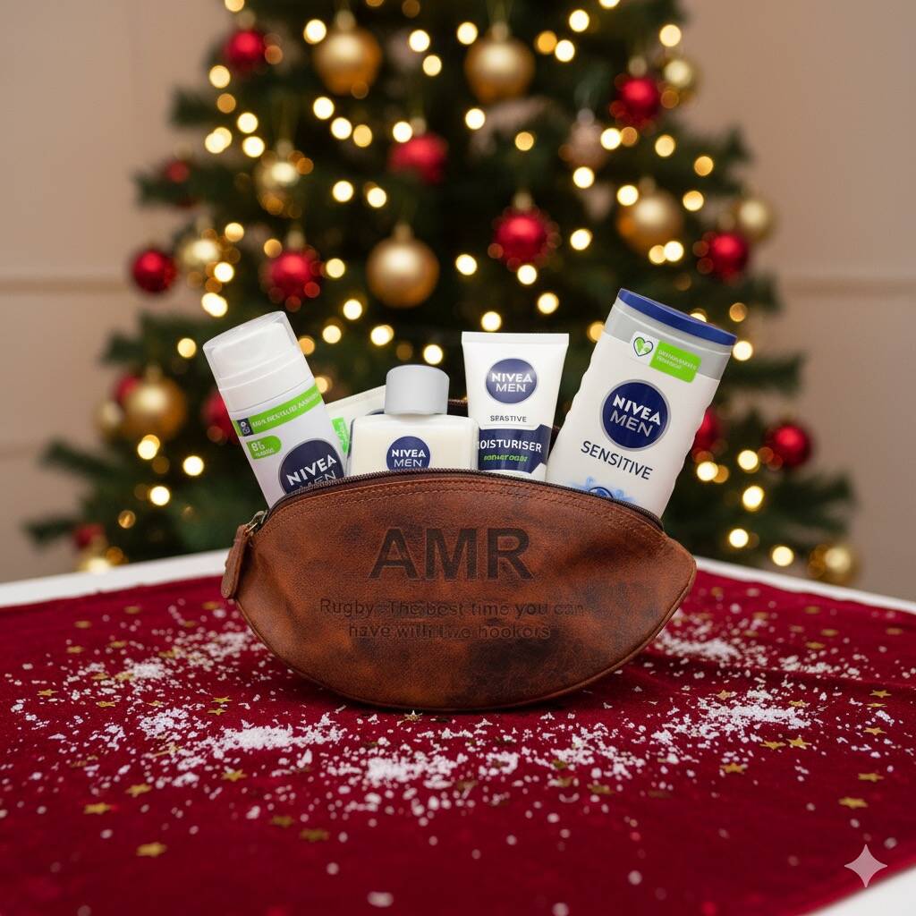 Striking handmade buffalo leather rugby ball washbag with watrproof lining, ideal for rugby players and fans. Personalised with any message.