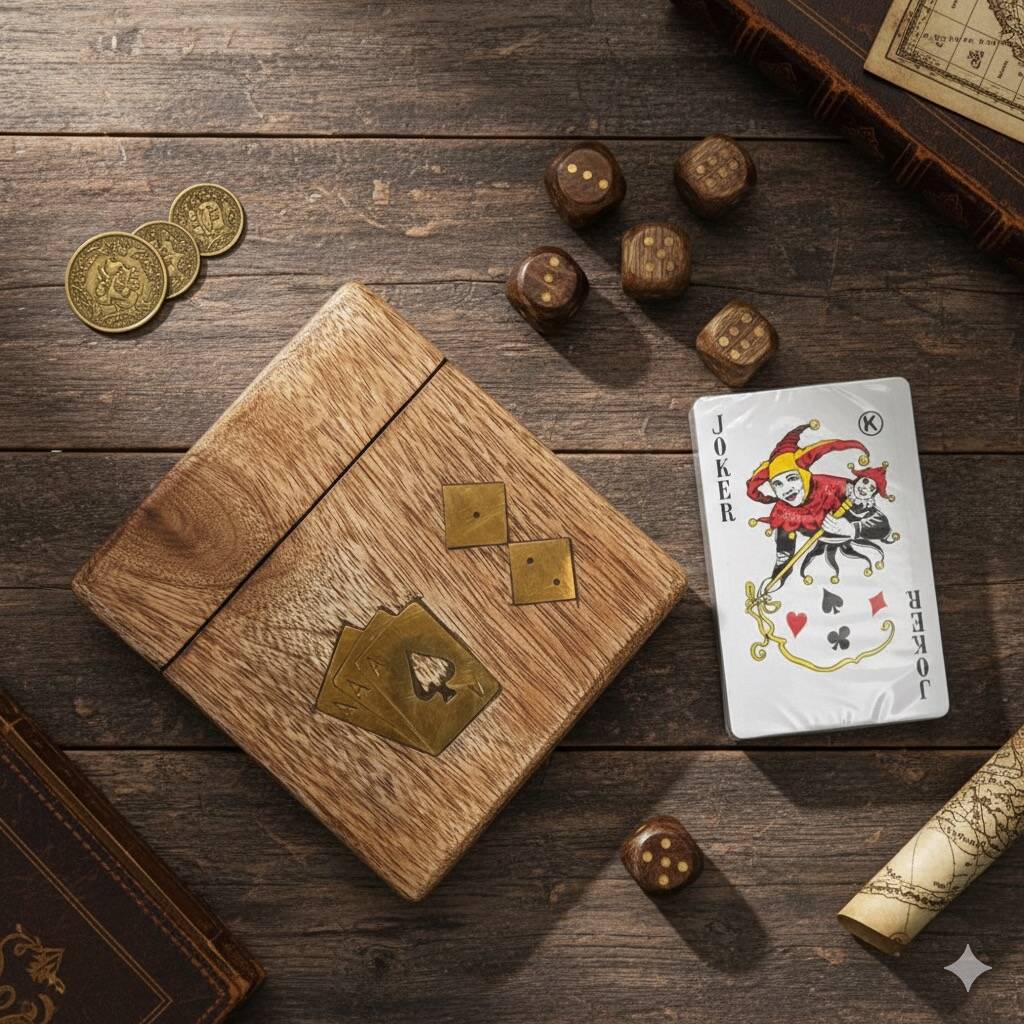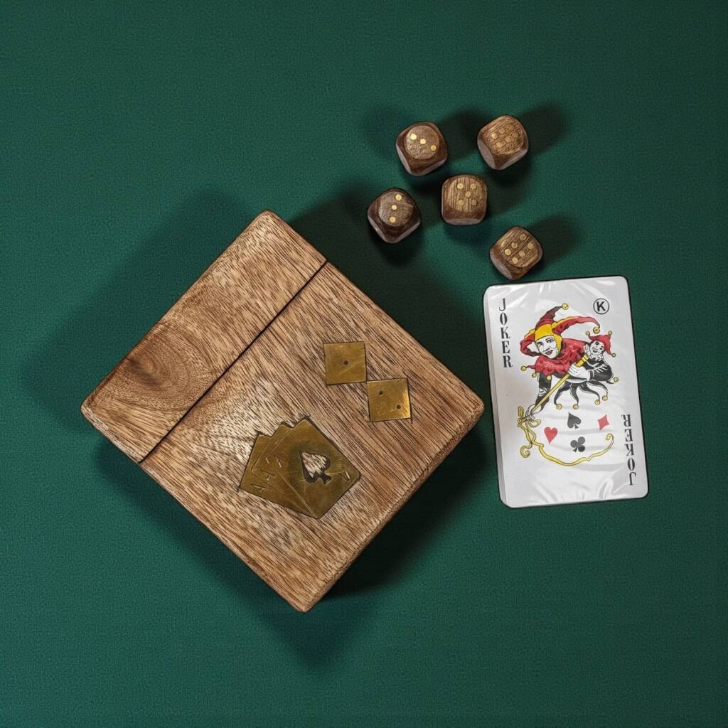 Inside the box, you’ll find a premium deck of playing cards and a set of handcrafted wooden dice, creating a versatile game set that suits quiet evenings, family gatherings, or moments of downtime with friends. The brass inlay detailing on both the box and dice adds a refined touch, transforming a traditional game set into a luxury keepsake. This balance of high-quality materials and timeless design makes it an excellent choice for card players and lovers of classic games.