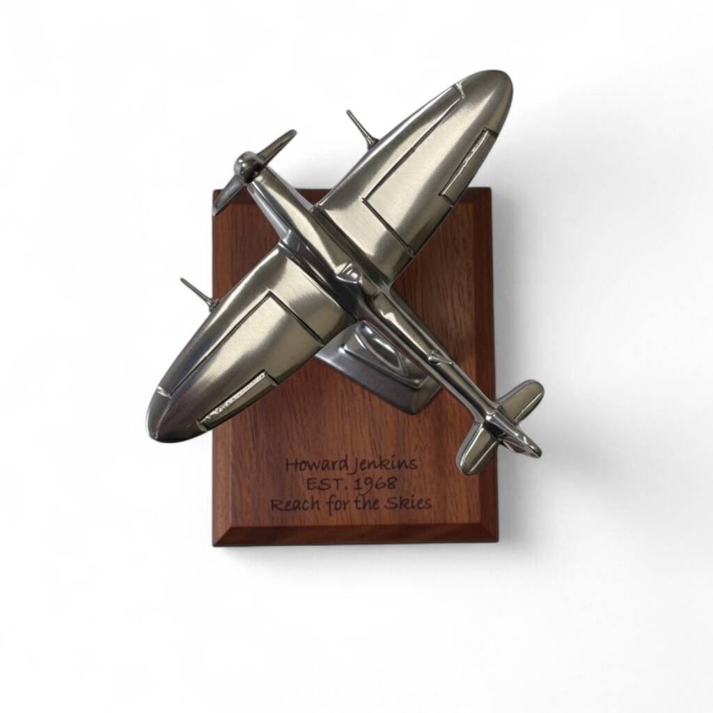Each model is mounted on a solid wood base, you can elect to buy a surface stand or a base to wall mount, available in three colours and four elegant font styles. Personalise the base with a name, date, or special message to create a meaningful and lasting keepsake. Whether given as a gift for aviation enthusiasts, a retirement present, or a collector’s display piece, this Spitfire model embodies craftsmanship, heritage, and timeless appeal.