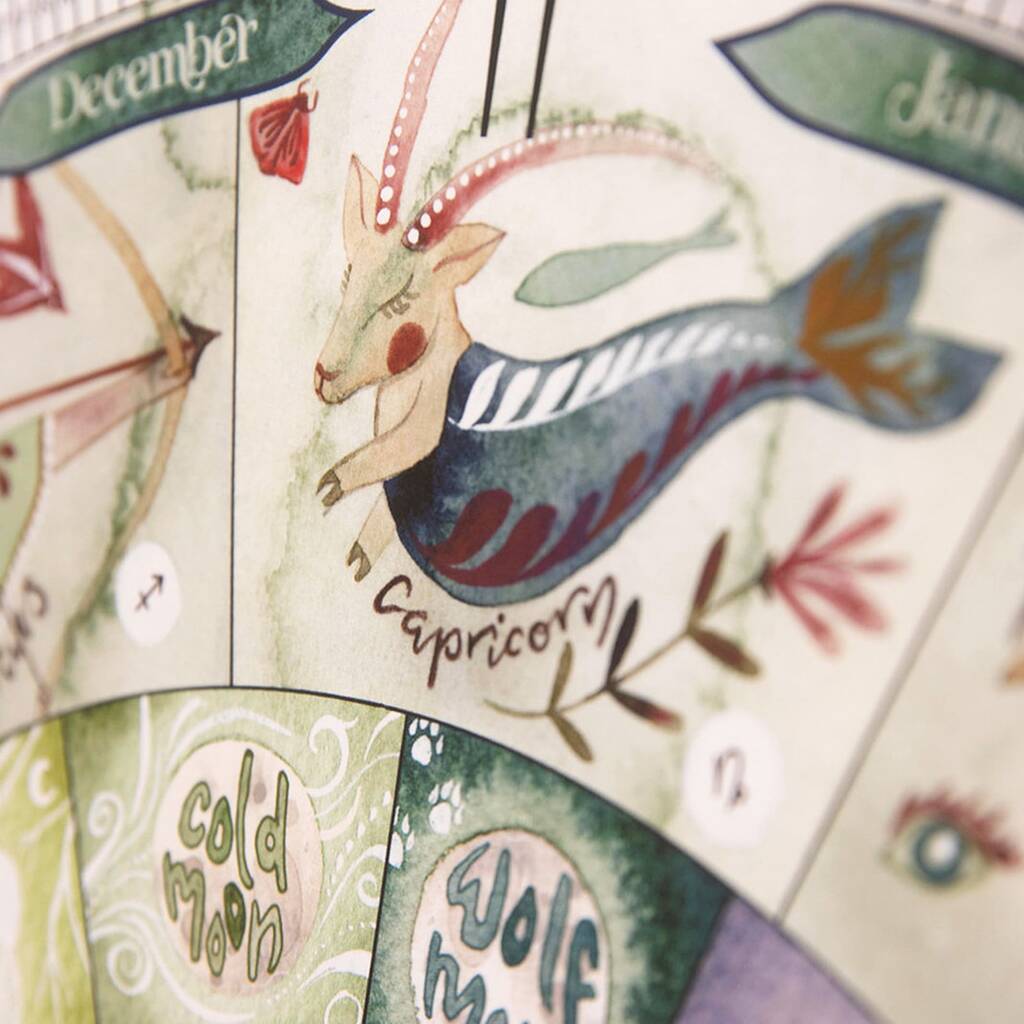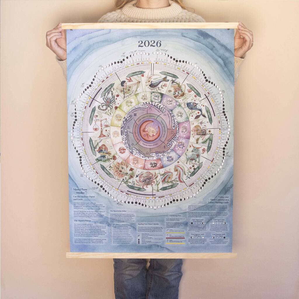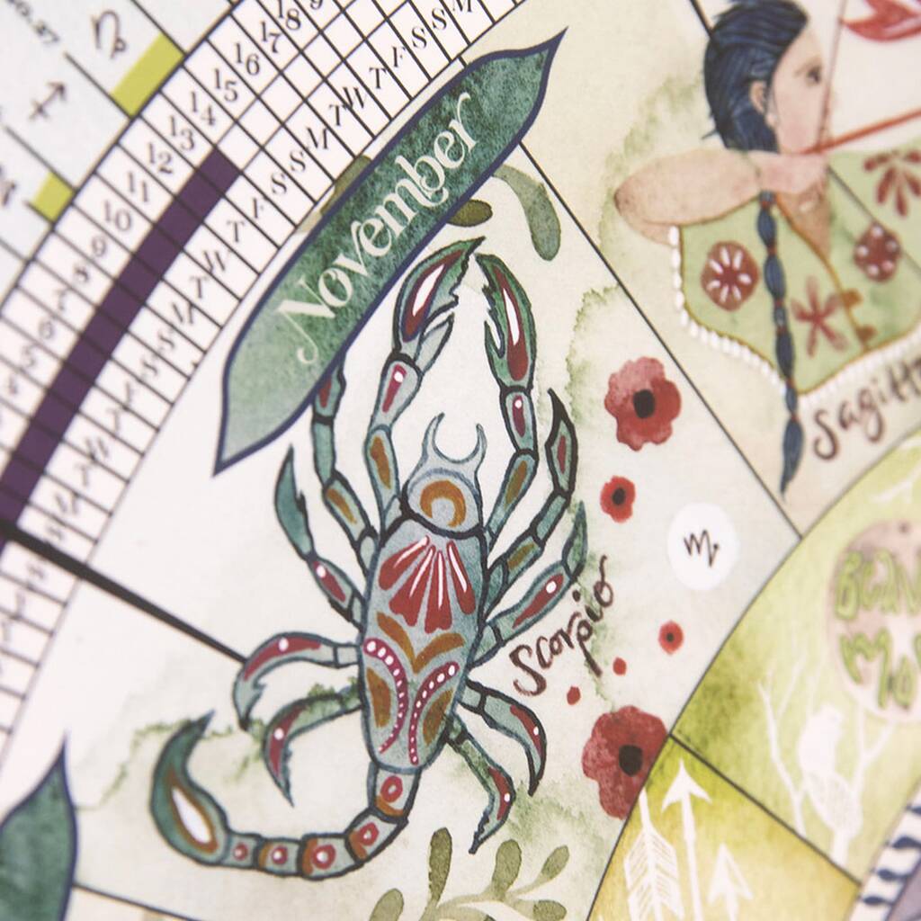 Designed for the Northern Hemisphere, this calendar artwork showcases the movements of the moon and astrological transitions. Showing you exactly what phase the moon is in on any given day and which zodiac sign it is transitioning through.