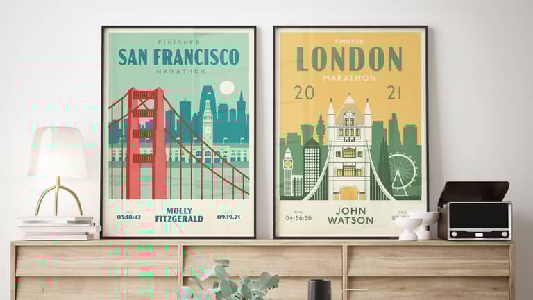 We're a couple with a shared love of design and running, and have run many races from 1 mile to ultra-marathon distances. We believe our personalised prints are a celebration of an achievement, produced to look great on any wall in your home.