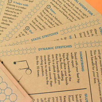 Neatly presented in a kraft A6 wallet, this handy bundle is full of bite-sized cards covering essential topics every runner needs: from dynamic stretches and recovery tips to nutrition advice, strength-building exercises and mental strategies for staying motivated. It even comes with an A3 training wall planner — perfect for mapping out runs and staying on track.