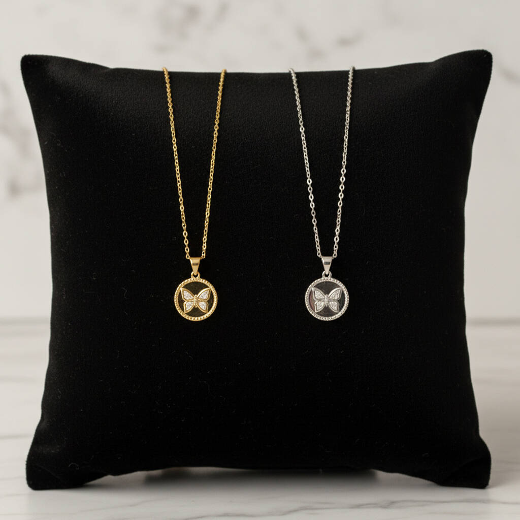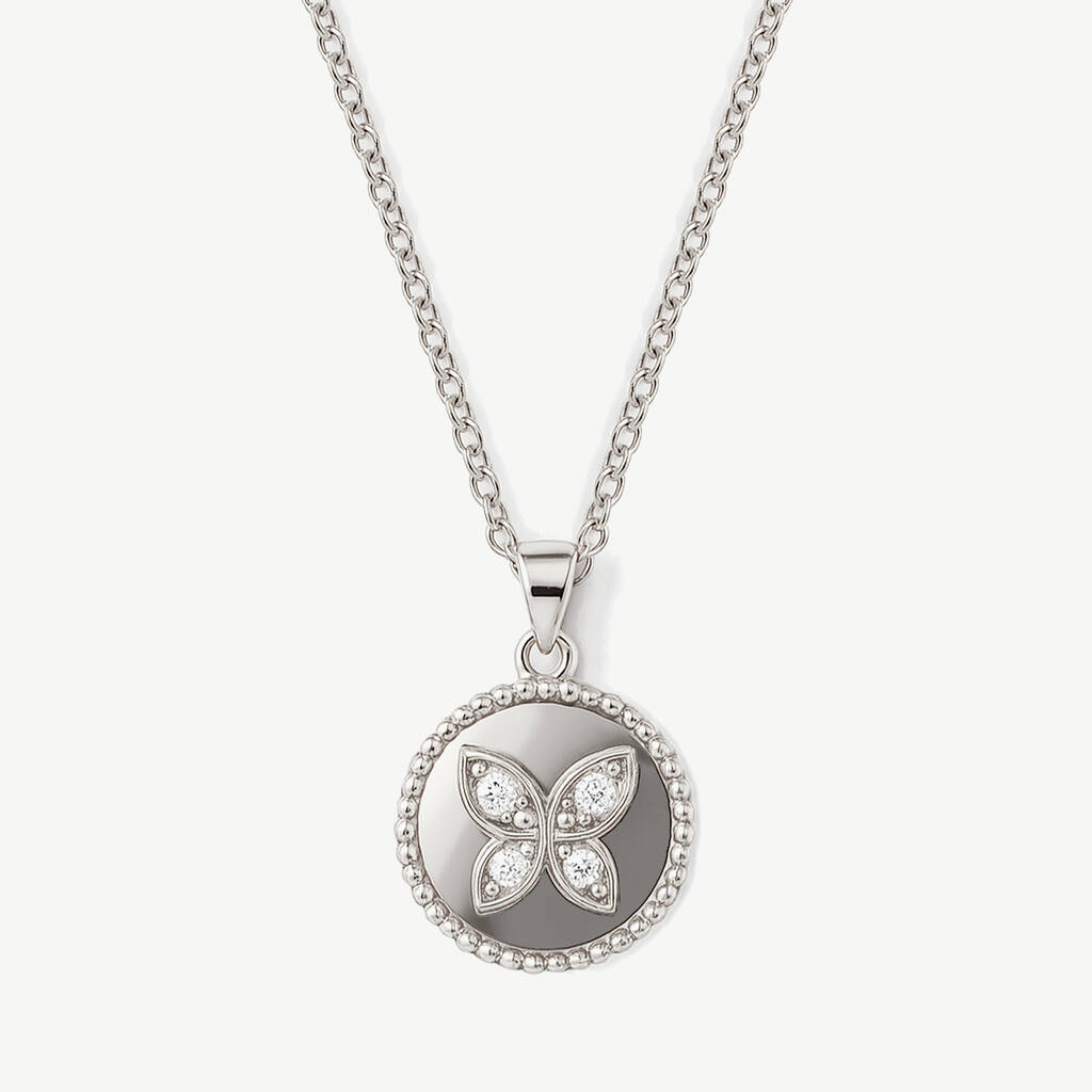 Delicate and effortless. This coin pendant necklace features a small butterfly detailed with fine cubic zirconia stones for just the right amount of sparkle.