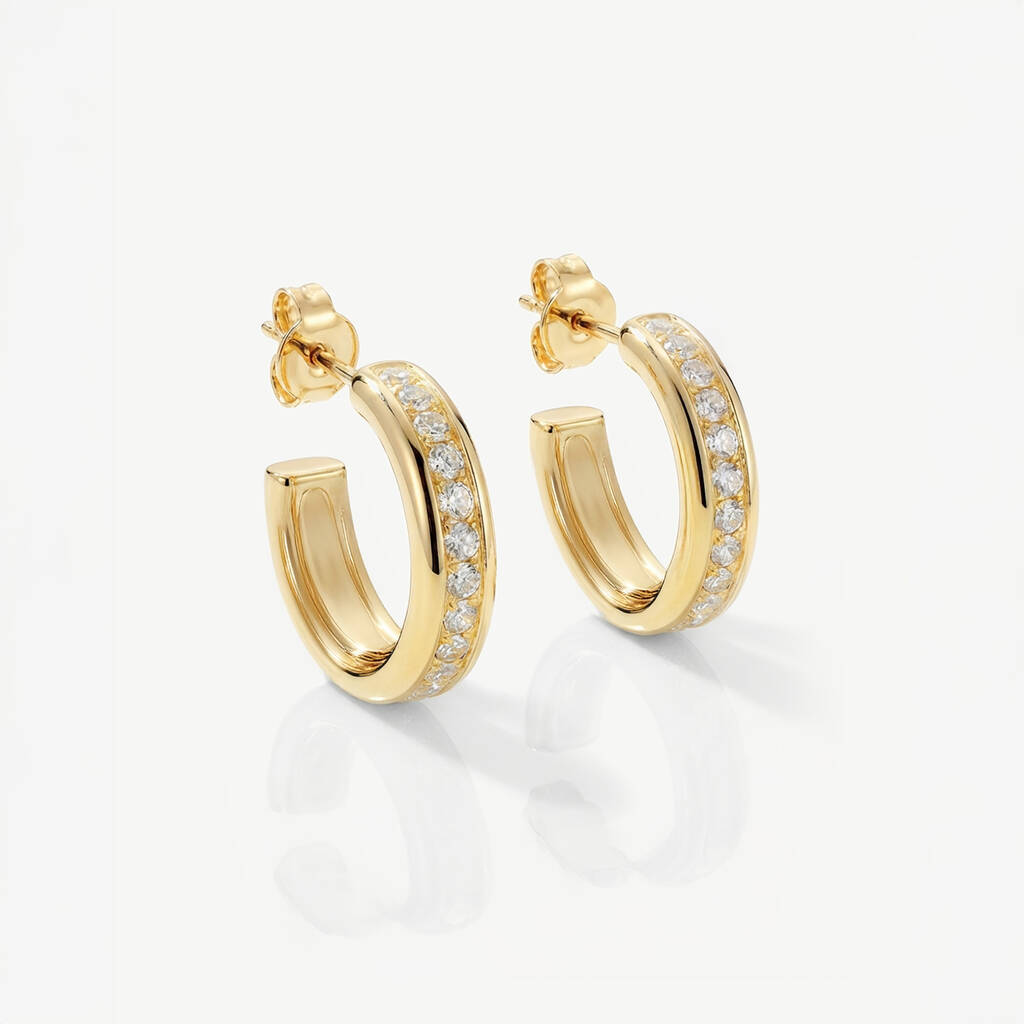 Key Features:• Thick gold huggie hoop earrings set with cubic zirconia stones