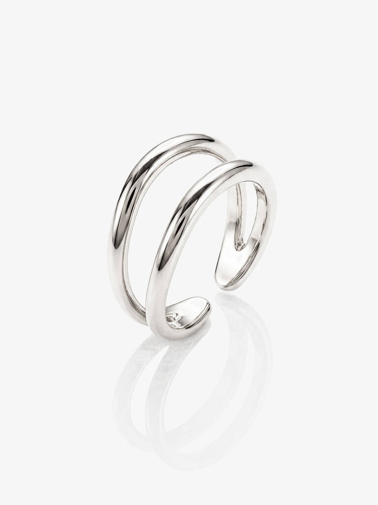 The open, adjustable design allows for a flexible fit, making it easy to style on any finger or give as a gift without needing to know the exact size. Its sleek double-band silhouette adds a subtle sculptural touch, giving you a contemporary look that still feels timeless and understated.