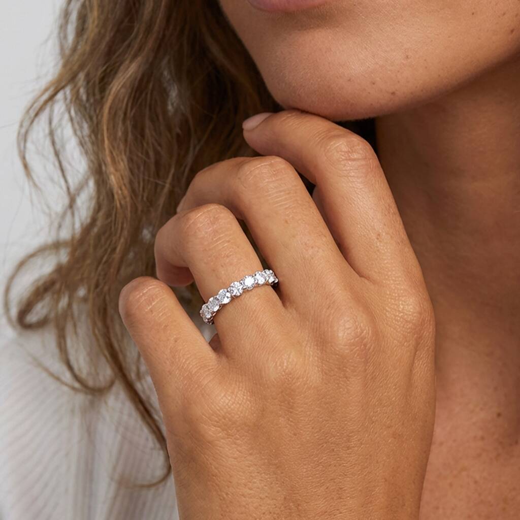 Simple. Sparkling. Timeless. This dainty silver band features round-cut cubic-zirconia stones set all around for subtle, everyday shine.
