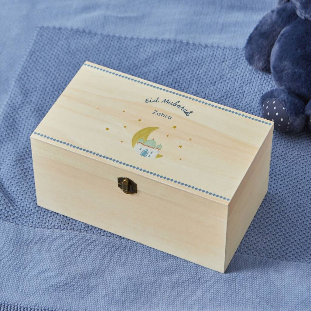 Mark the magic of Eid and treasure it for years to come with our personalised Eid keepsake box, made especially for little ones. Crafted from FSC® certified wood, this beautiful box features a secure catch to safely store precious things, from Eid treats and sweets to keepsakes collected along the way. The lid showcases a charming starry scene with soft blue borders, a glowing crescent moon and a peaceful mosque, alongside the message “Eid Mubarak [Name]”. Thoughtfully designed for children, it’s perfect for popping in cards, small gifts and mementos from a joyful celebration, then keeping them safe all year round. Personalised just for them, it becomes a