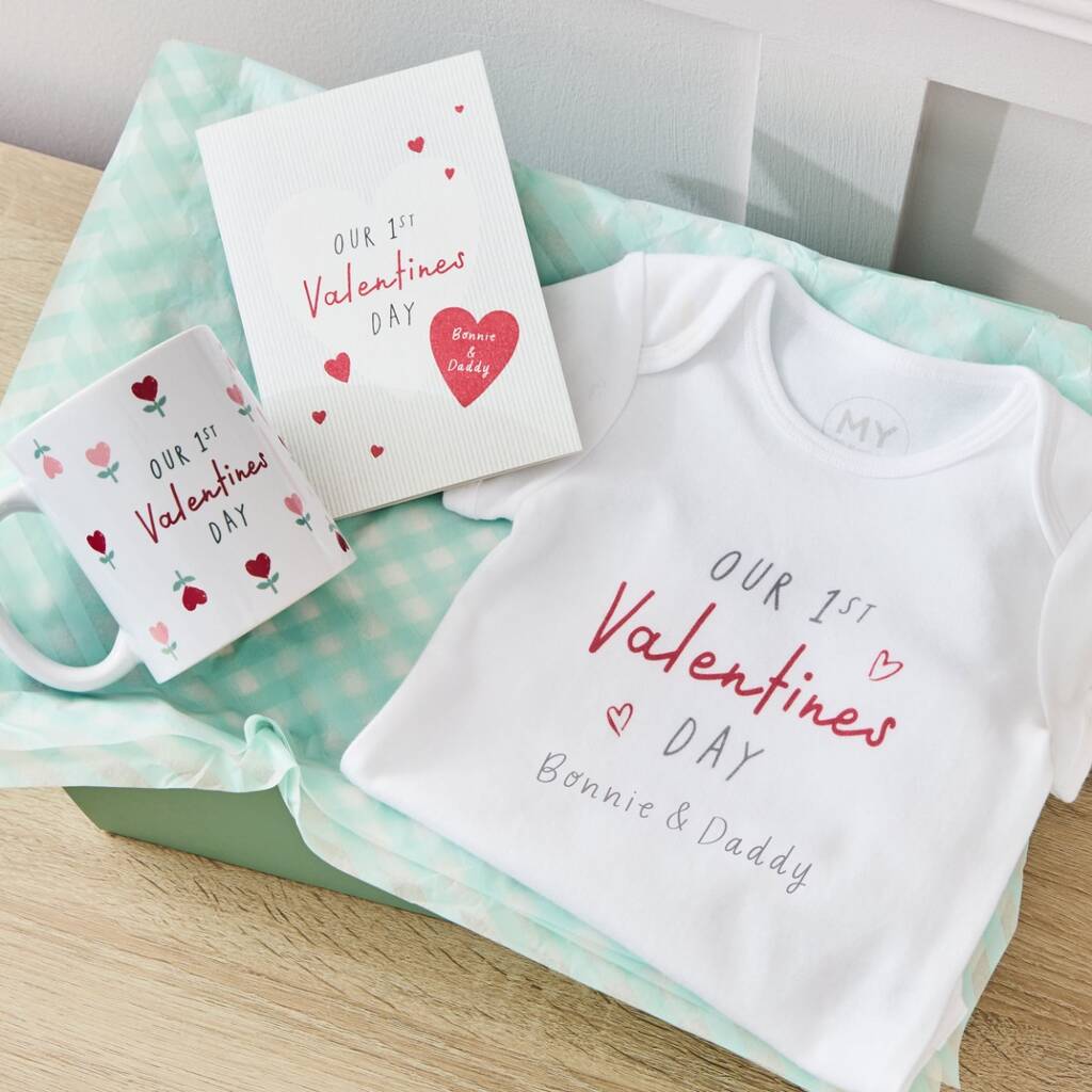 Celebrate your little love’s very first Valentine’s Day with our one of a kind, personalised Our 1st Valentine’s Day Gift Set.Add your little one’s name and a heartfelt message to make it a keepsake they’ll treasure forever. The lovely bodysuit is the perfect way to mark this once-in-a-lifetime moment. Made from soft white cotton with easy popper fastenings, it features a loving message that can be personalised with both your names, making it a keepsake you’ll cherish. To complete the set, pretty our 1st Valentine's Day mug is adorned with a beautiful floral love heart motifs, creating the perfect memento of this unforgettable day.