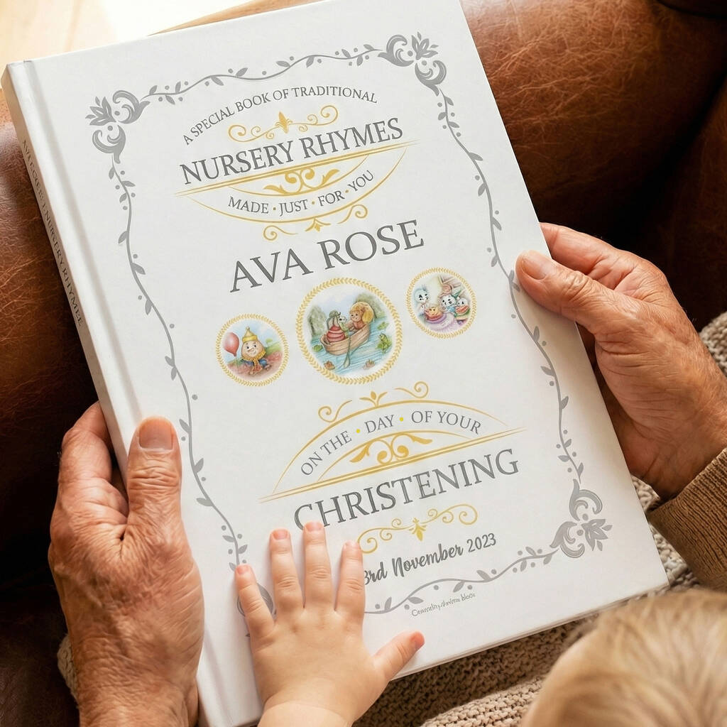 A Very Special Personalised Christening Gift Book of Traditional Nursery Rhymes Made Especailly For That Special Day. Customise with Child's Name, Christening Date and Message