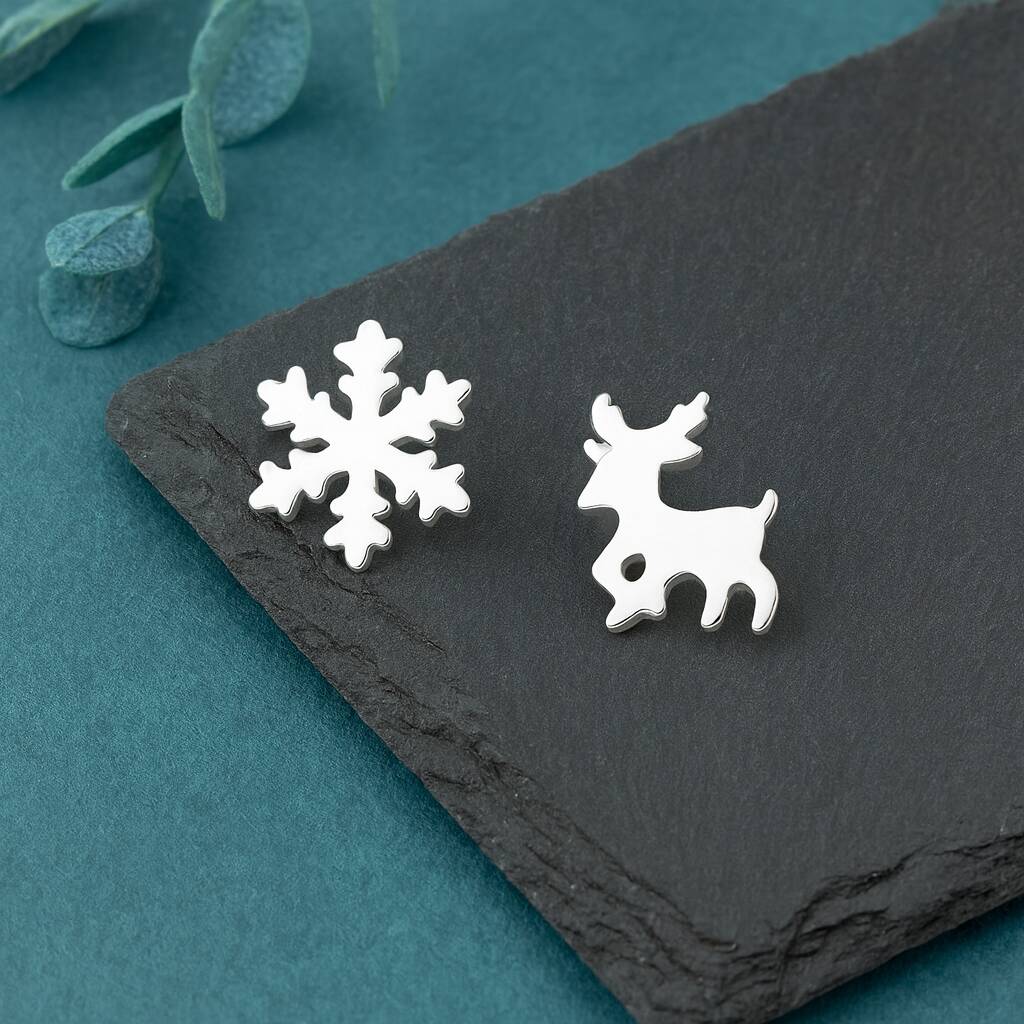 Merry Little Christmas Reindeer And Snowflake Sterling Silver Earrings