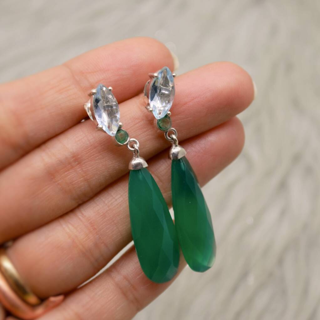Green Onyx, Blue Topaz, Emerald Silver Earrings