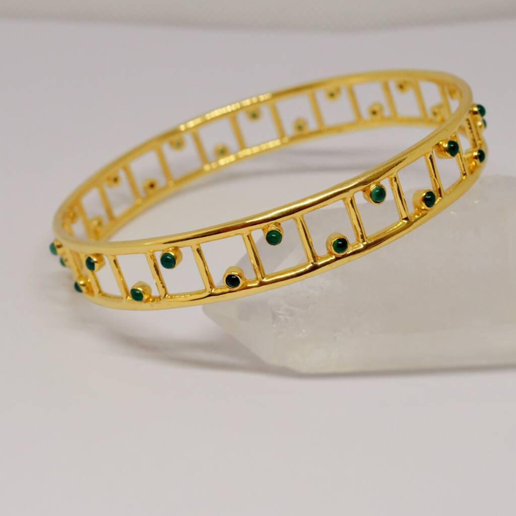 Add a touch of elegance with this Green Onyx Gold Bangle Bracelet, a perfect blend of sophistication and charm. This dainty gemstone bracelet showcases a captivating green onyx stone, encased in a sleek gold bangle design, making it a versatile piece for any occasion. Crafted with sterling silver and plated with gold, this silver bracelet is ideal for those who appreciate modern elegance. Measuring 6.5 cm in diameter (20.4cm circumeference), it’s perfect for bracelets for women or a thoughtful gift for her. Inspired by Indian bangles, this green onyx bracelet is both unique and stylish. Whether as a birthday gift or part of a layered look, this gemstone bangle is a timeless addition to any jewelry collection.