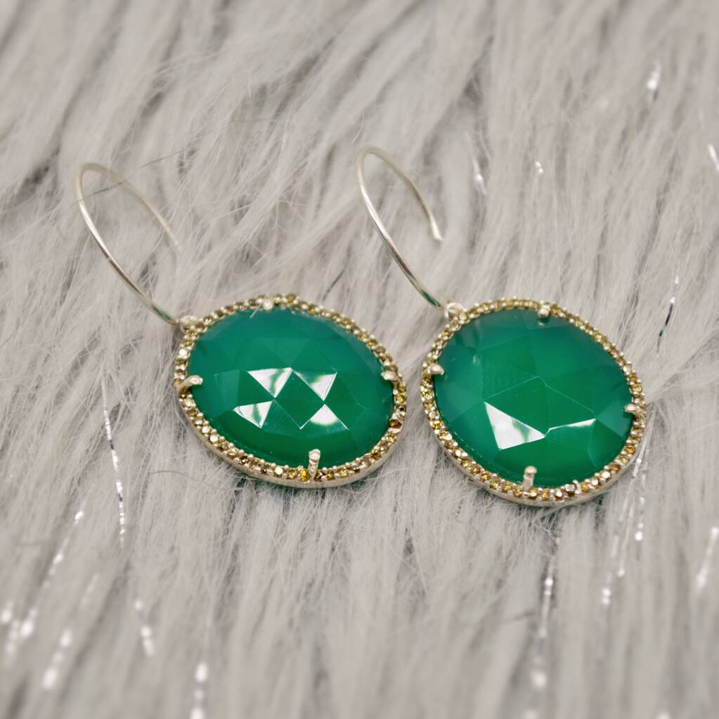 Green Onyx Silver Dangle Earrings: Oval Drop