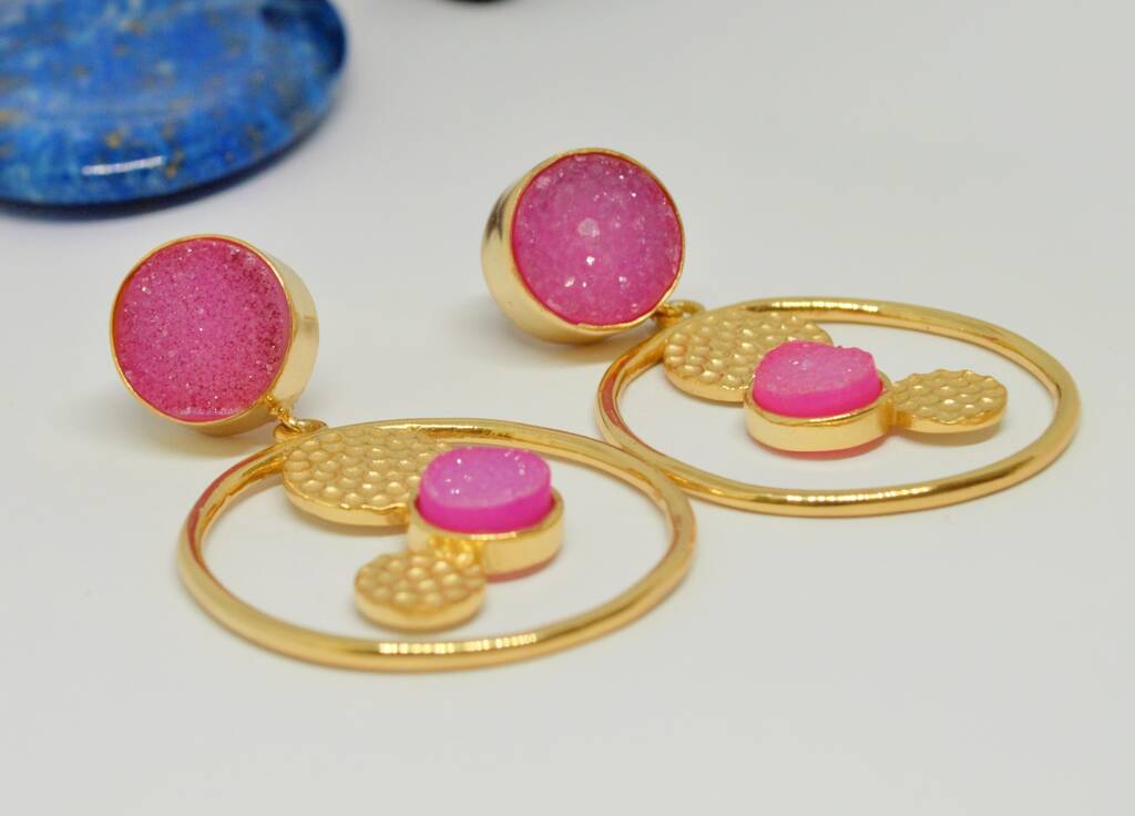 Elevate your style with these exquisite Pink Druzy Agate Gold Earrings, a blend of elegance and bold design. Crafted with shimmering druzy agate stones, these gold plated sterling silver earrings showcase a unique agate geode texture. Their captivating pink hue makes them perfect as statement earrings for special occasions. Designed as jhumka earrings with an Indian-inspired touch, they bring a cultural charm to modern aesthetics. Whether you’re looking for agate earrings, druzy earrings, or stylish pink earrings, these versatile pieces are ideal. Perfect for gifting, these agate jewelry creations are a standout choice for those who love Indian earrings with a contemporary twist. Add these gold earrings to your collection and shine with timeless elegance.