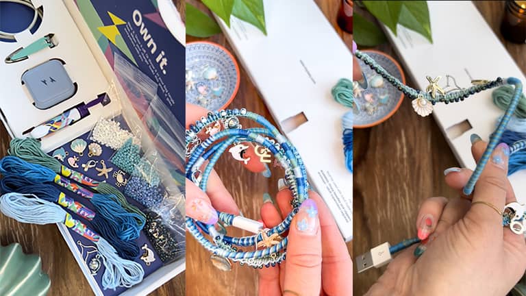 A Certified Iphone charger or Andriod charger included in your Myzeey box, along with everything needed to make your Myzeey charger lead. Right from the unique packaging box with its own tray allowing you to store your accessiories. Uniqe coloured clasp so you can take your charger with you on the go on your wrist, clippped on your bag or wear as lanyard at a festival maybe, perfect for holidays and sleepovers? 4 coloured threads, 4 bags of beads, upto 10 letter charms, also thread cutters and marker pen to mark your lead for charms.