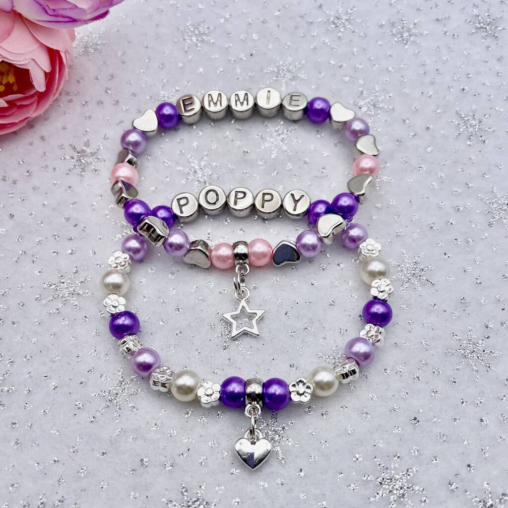Unique personalised beautiful glass pearl bead bracelet complete with either a heart shaped charm that you can pretend is direct from 'Father christmas xx' (complete with On the nice list tag), Snowman or Chubby Snowman charm, Santa charm, Sparkly xmas tree charm, Gingerbread man charm, Snowflake charm, silver hearts, flowers, 2 x stars or sparkly rings between the beads and a silver name. All bracelets are designed and made to order with the charm, name & colours of your choice, fantastic xmas eve/xmas day gifts and super cute & loved by all. My bracelets are made with top quality super strong special stretchy cord, no need to worry about it not fitting as it will obviously stretch.