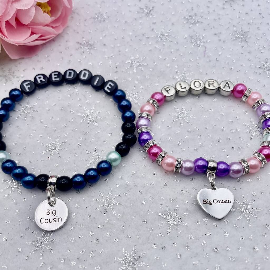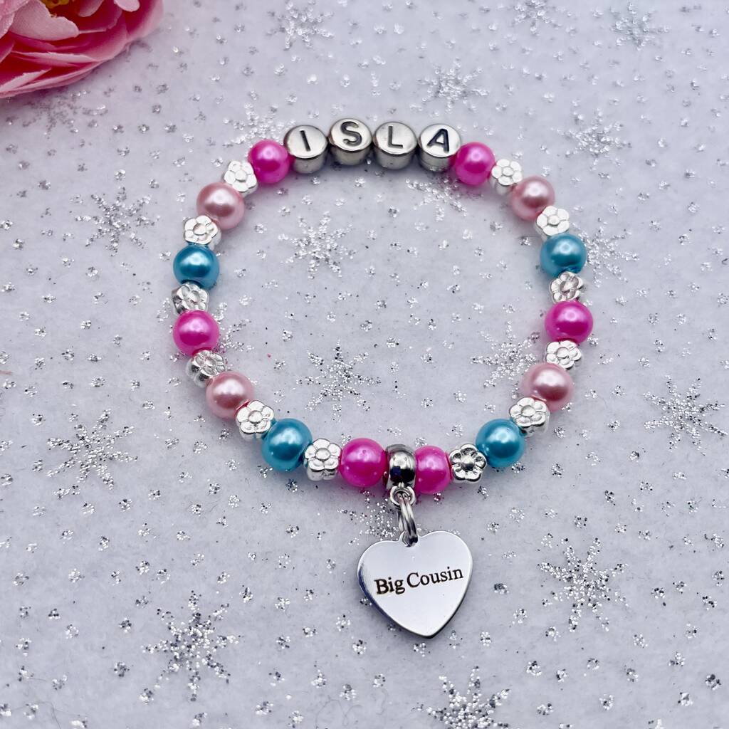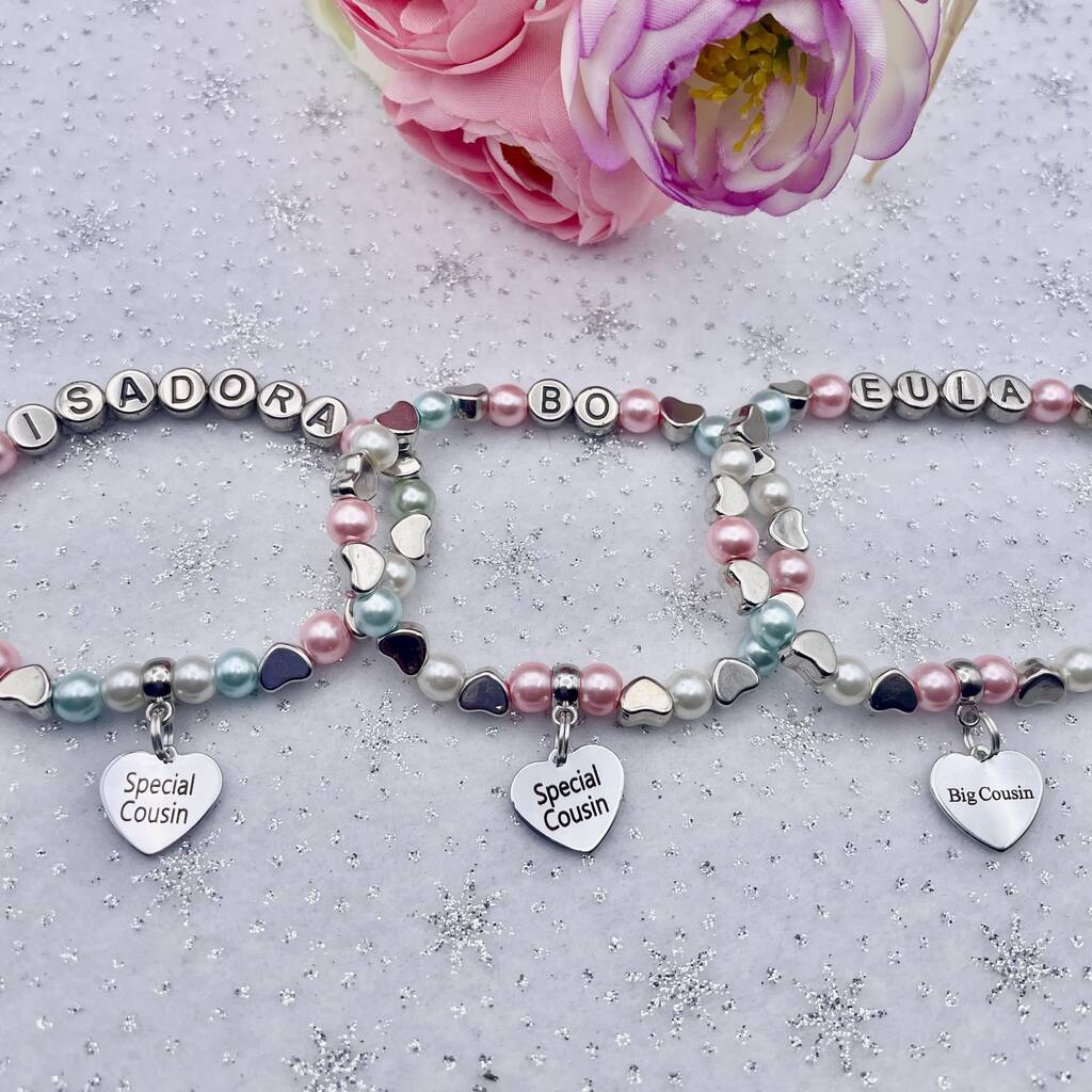 Unique personalised beautiful glass pearl bead bracelet complete with Special Cousin, Big Cousin, Little Cousin, Cool Cousin or Cousin charm, silver hearts, flowers, stars or sparkly rings between the beads and a silver name. All bracelets are designed and made to order with the charm, name & colours of your choice, fantastic gifts & so cute. My bracelets are made with top quality super strong special stretchy cord, no need to worry about it not fitting as it will obviously stretch.