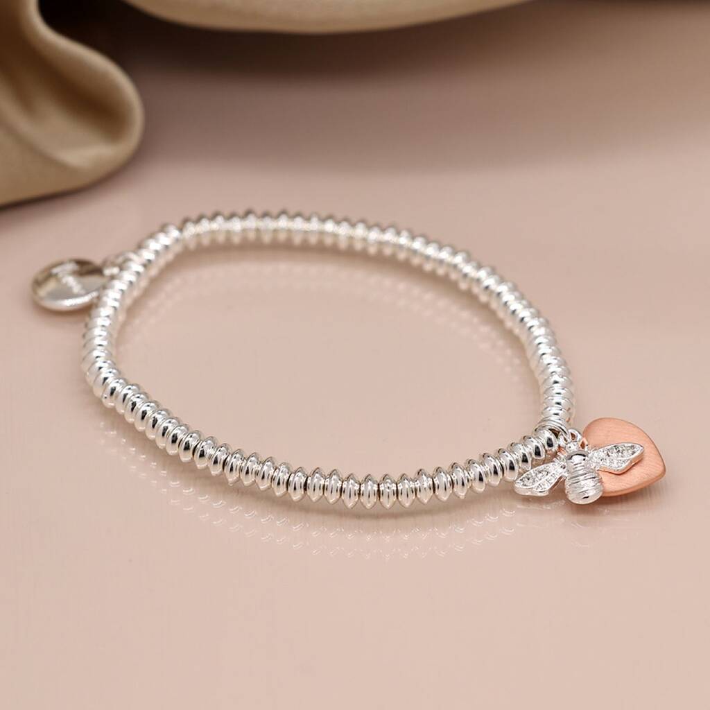 Silver Plate Bead Bracelet With Rose Gold Heart And Bee