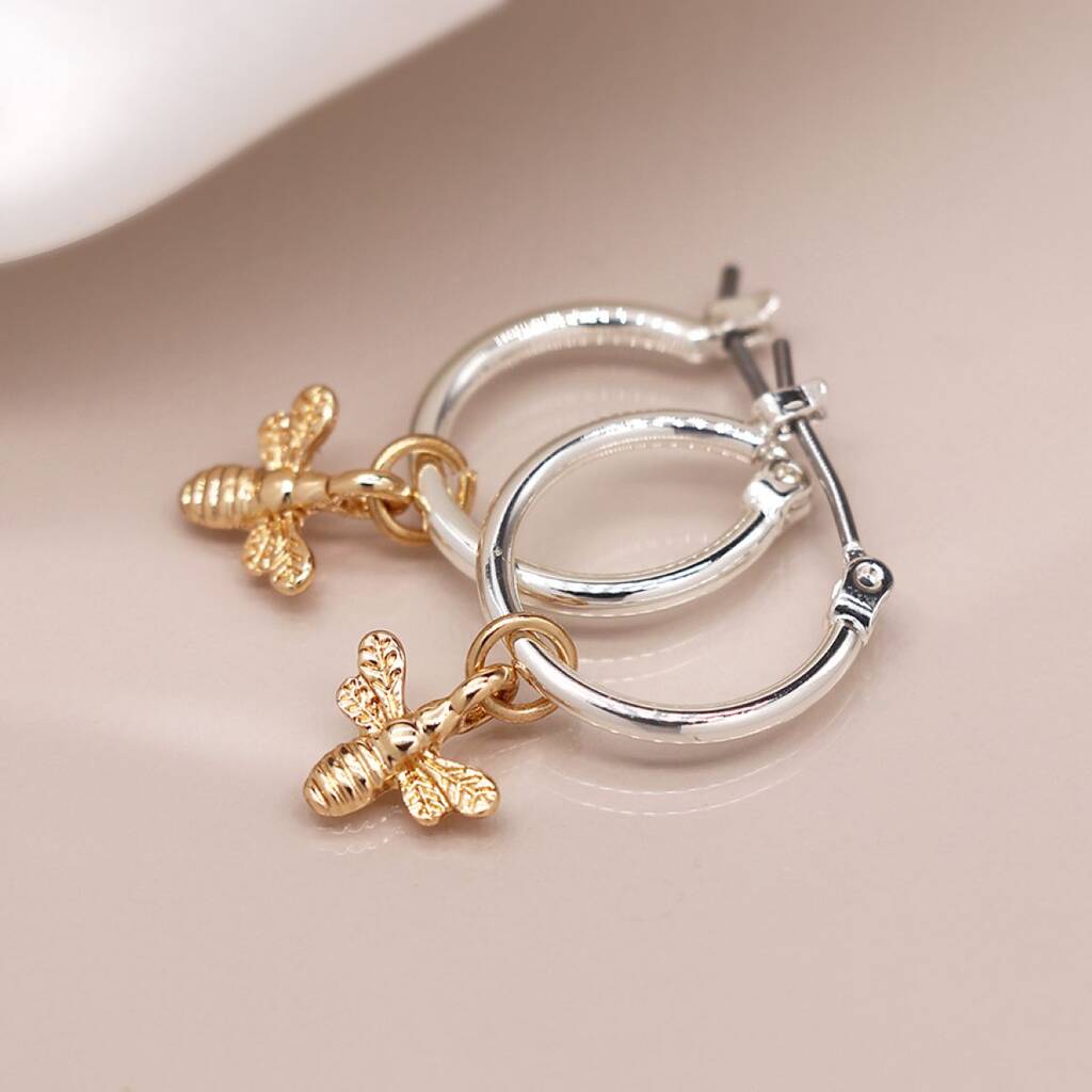 Silver Plated Hoop Earrings With Golden Bee Charm
