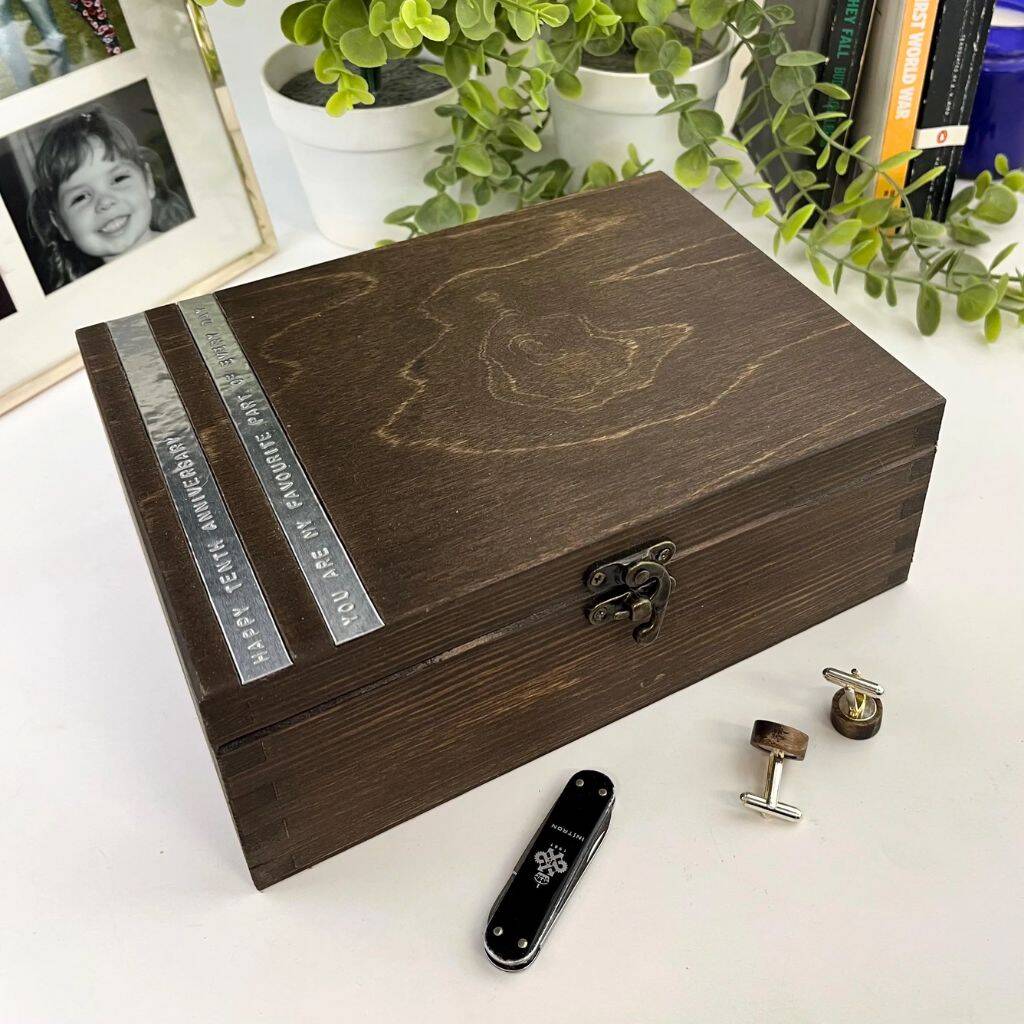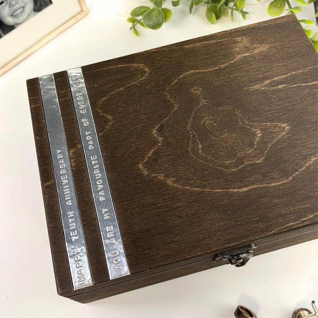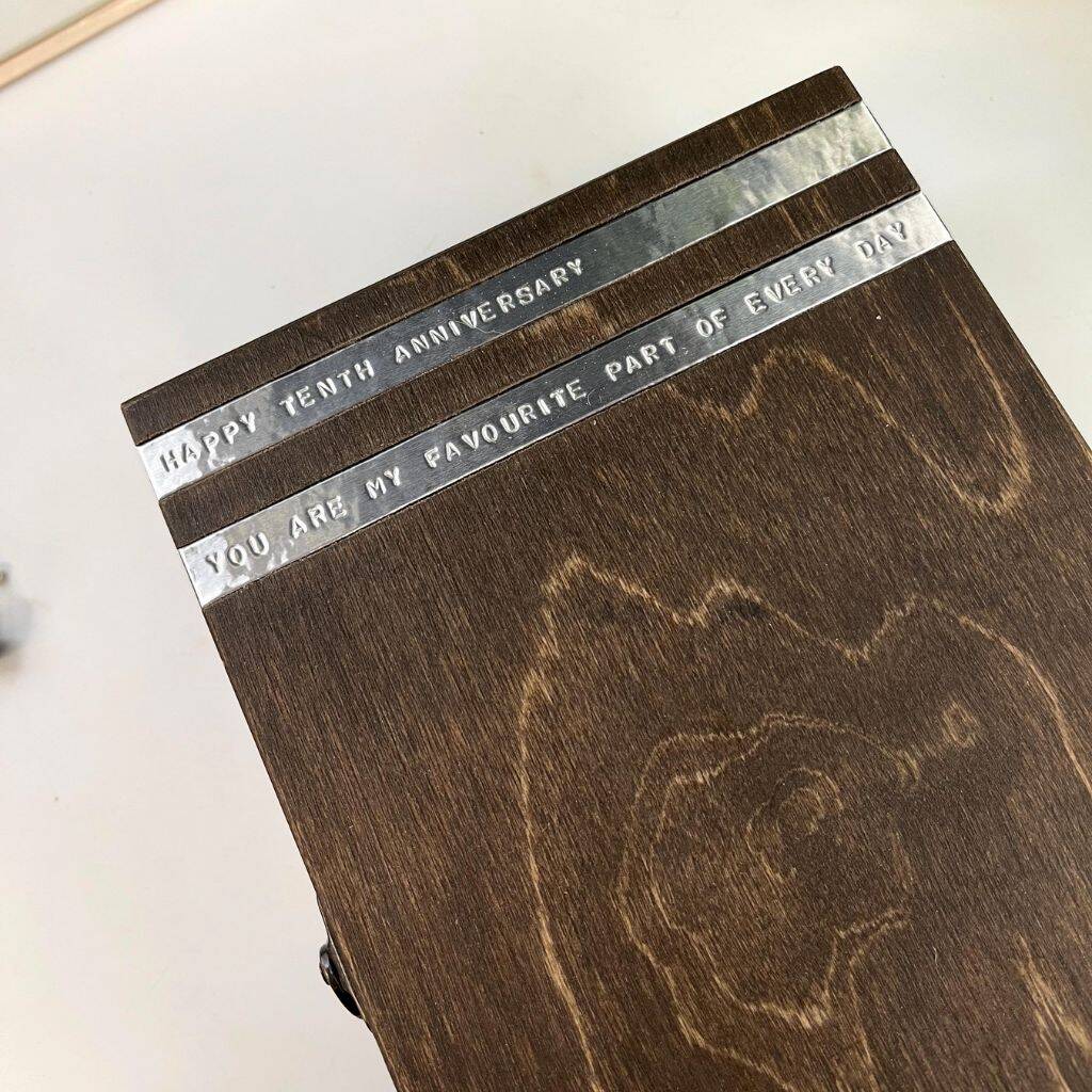 Individually crafted in our UK workshop, each box is meticulously made to order and personalised with our distinctive techniques. Our method involves hand-stamping messages onto sleek aluminum, creating a stunning contrast against the deep tones of the wood, resulting in a truly breathtaking combination.