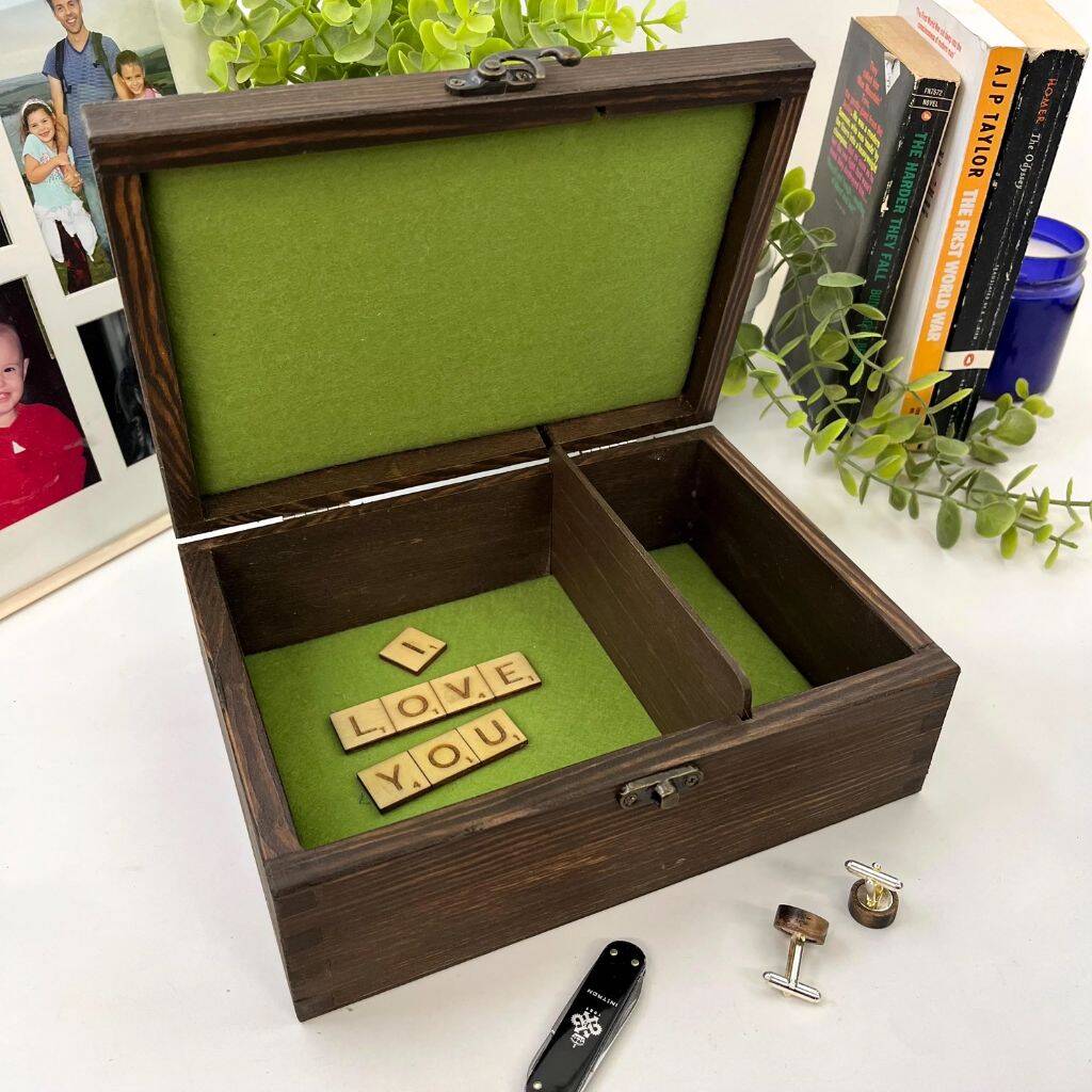 This is more than just a jewellery box; it's an embodiment of love and thoughtfulness. It's a heartfelt gesture that speaks volumes, ensuring that every time it's opened, it evokes a smile and a flood of cherished memories. Ideal as a 5th-anniversary gift (wood) or a birthday surprise. No matter the occasion, our handcrafted wooden jewellery box is the ultimate selection.