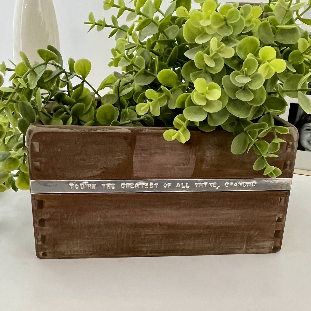 You’ll love this planter for its handcrafted beauty, with each one carefully shaped and finished by hand, ensuring that no two are exactly the same. The rustic aesthetic, created through our signature burnt finish, enhances the natural grain of the wood, offering a rich, earthy tone that beautifully complements any plant or setting. What makes it truly special is the personalised copper inlay, where you can add your own message of up to 40 characters, making this planter uniquely yours. Versatile and stylish, it's perfect for indoor spaces, adding a touch of personality to any home. It also makes an unforgettable gift, whether for a housewarming, an anniversary (especially the 7th, with its traditional copper theme), or simply as a thoughtful, one-of-a-kind gesture.