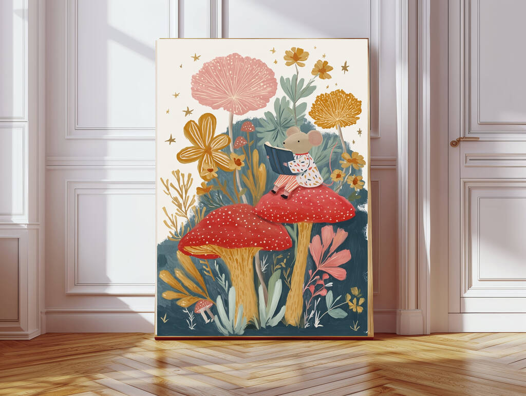 Mouse Reading Mushroom Nursery Art Print