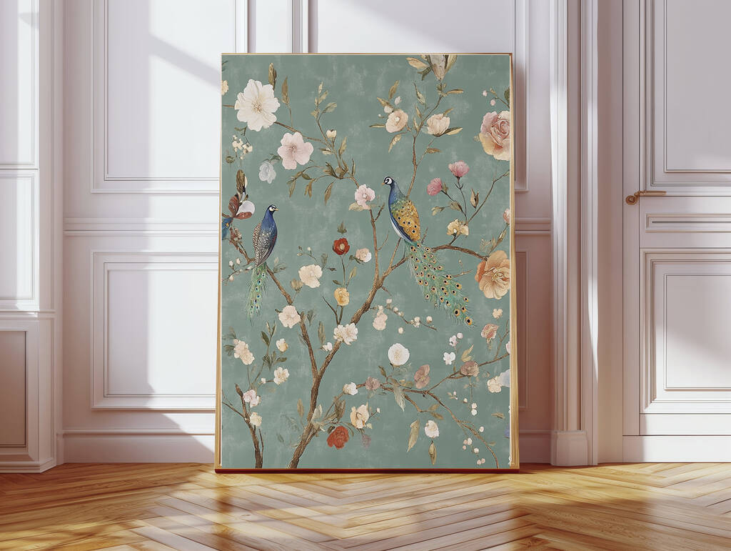Set Of Two Chinoiserie Pastel Green Floral Bird Art Prints