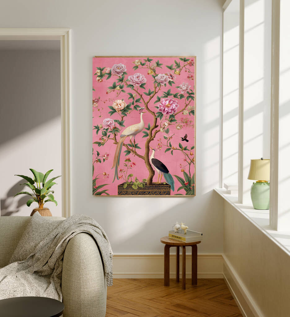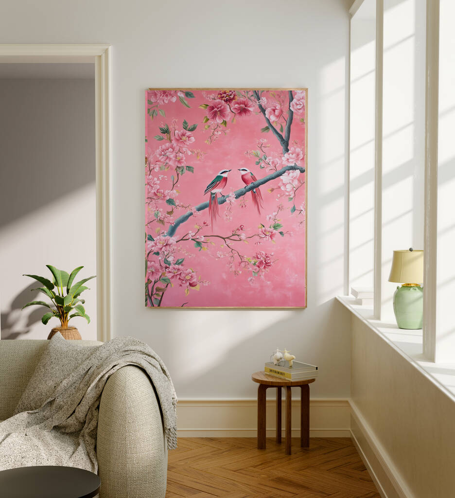 Set Of Two Chinoiserie Pink Floral Bird Art Prints