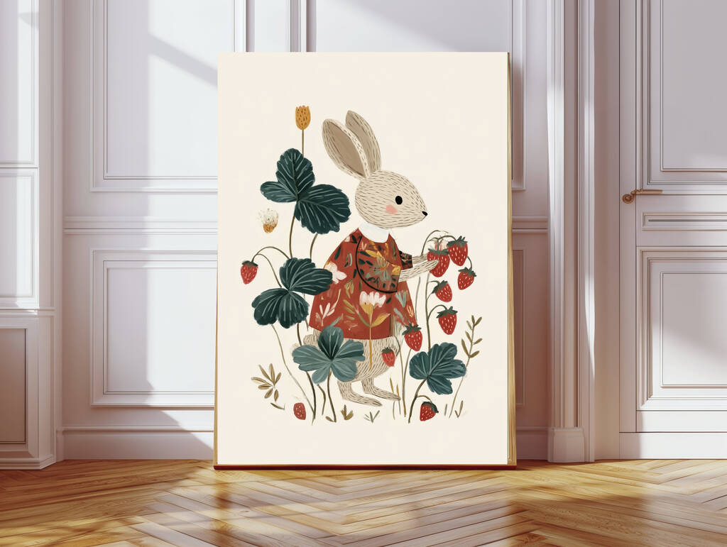 Strawberry Picking Rabbit Nursery Art Print