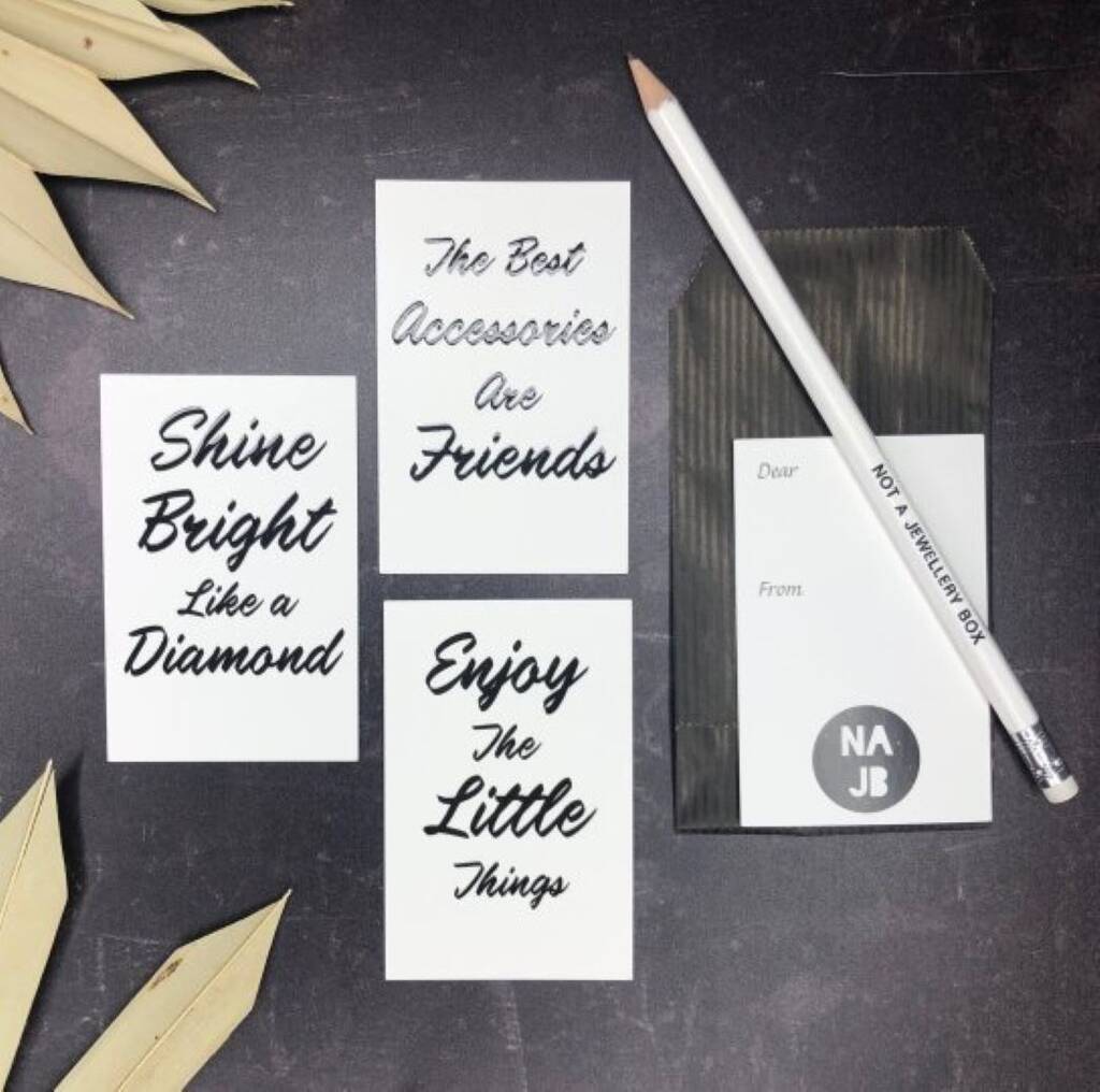Add a gift card to your order, choose from one of our quirky jewellery inspired quotes. The writing is raised from the card in gorgeous glossy black. The reverse of the card is ready for a gift message.