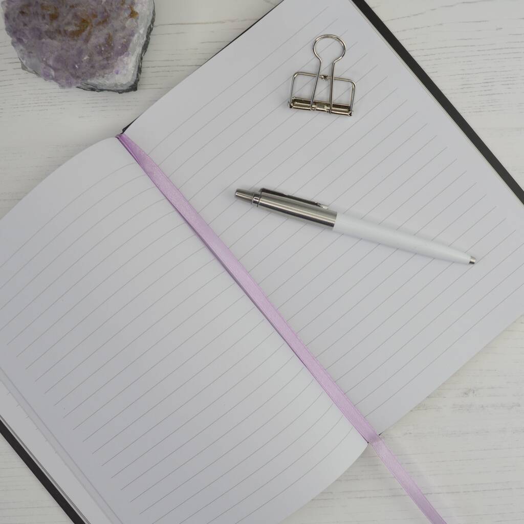 The pages are lined, with 100 sheets / 200 pages—ample space for thoughts, intentions, and creative writing. There is a ribbon divider for easy navigation, plus luxurious gold page edges for an elegant finish.