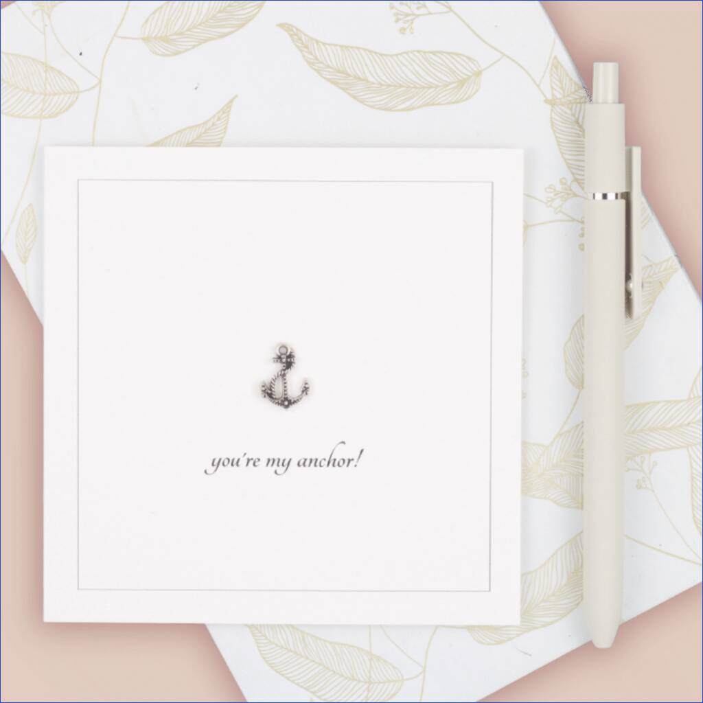 Introducing our unique handmade card, featuring a sleek square layout with a mounted metal anchor and the heartfelt message: 'You're my anchor!' Add a personal touch with customisation.
